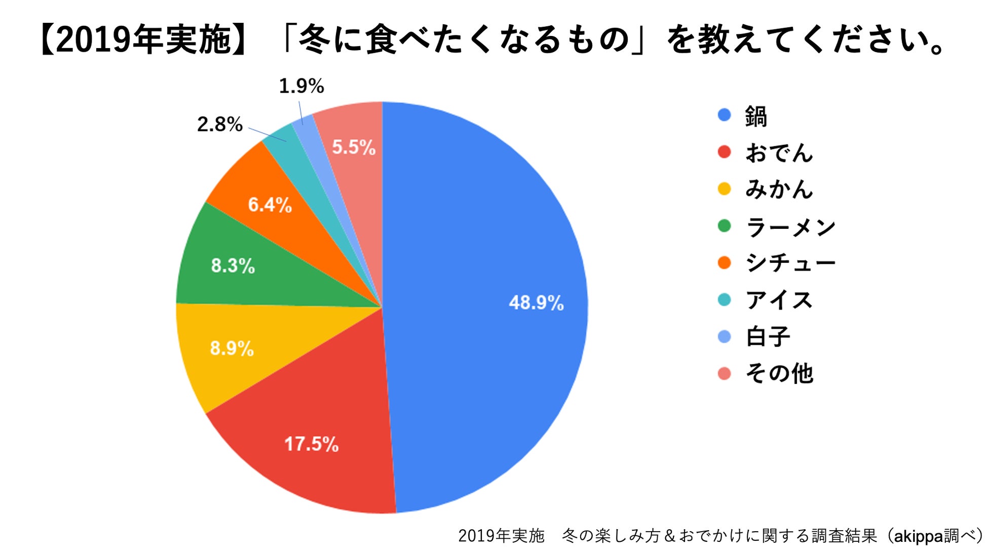 また、2019年に実施した調査(※)でも「鍋」(48.9%)、「おでん」(17.5%)がトップ2に挙げられており、毎年寒い冬には温かい鍋料理を食べたくなる人が多いことが推測できます。