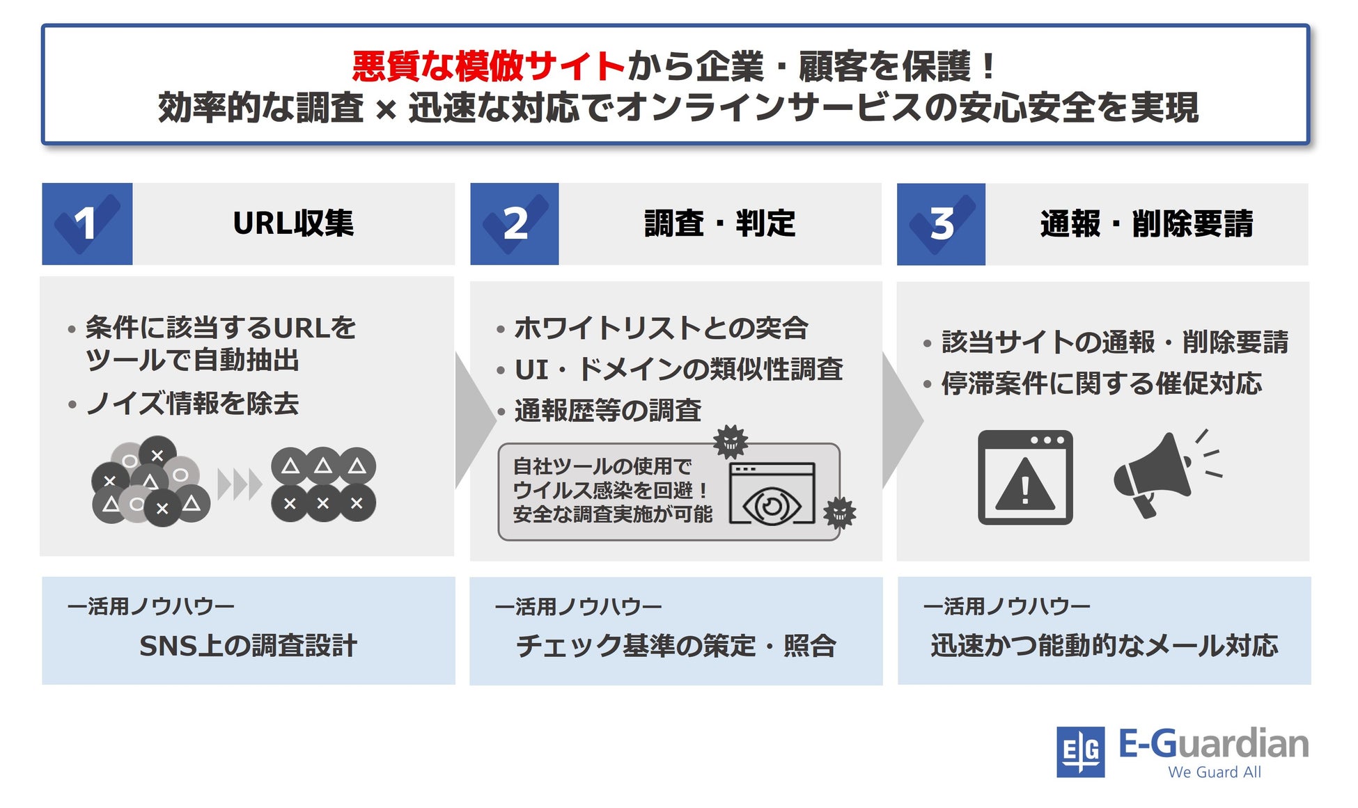 このような状況を受け、イー・ガーディアンは、フィッシング詐欺等で悪用される偽サイトを検知・通報する「フェイクサイトテイクダウン」を提供開始する運びとなりました。