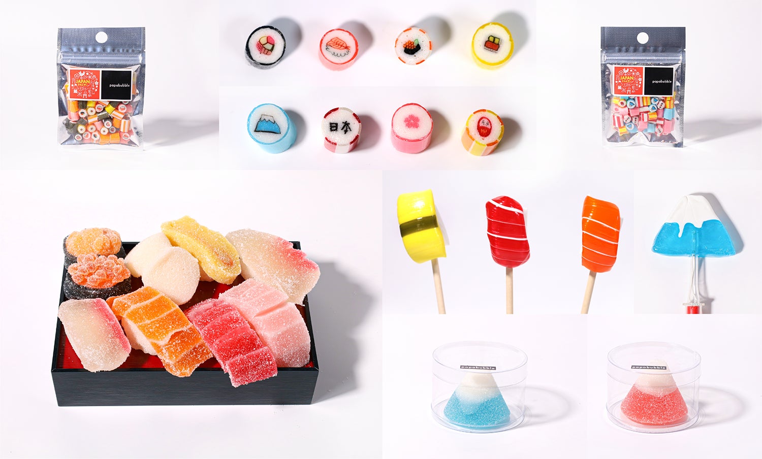 人気のお寿司キャンディや新作の富士山をかたどったキャンディやグミなど全9種が並びます。