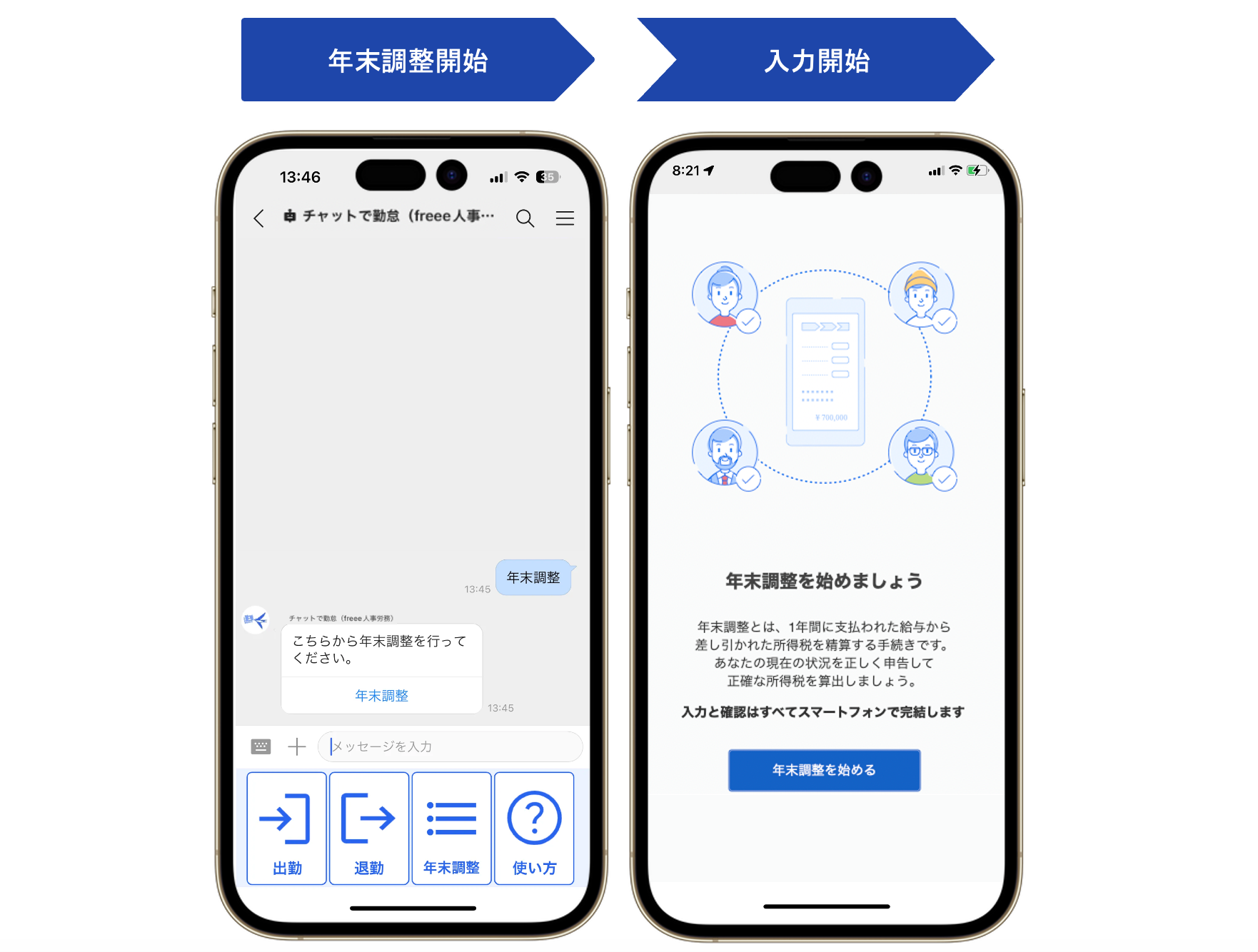 「チャットで勤怠(freee人事労務)」を利用することで、年末調整が開始された際の通知を「LINE WORKS」上で受け取ることができるほか、従業員が「LINE WORKS」から年末調整情報を入力することができ、入力と確認をすべてスマートフォン上で完結することができます。