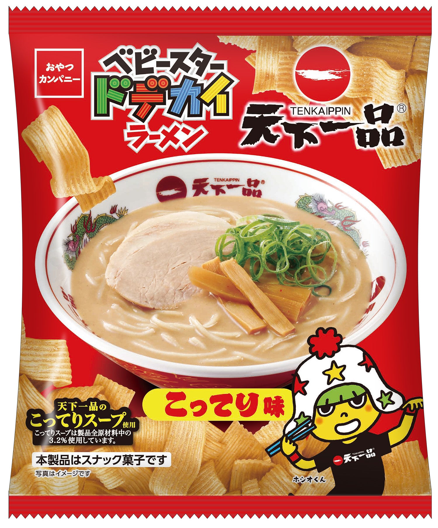 「ベビースタードデカイラーメン(天下一品 こってり味)」は、「こってり」の特徴である、鶏がらなどの食材をじっくり炊き出して作りあげられる口当たりはこってりながらも後味は驚くほどスッキリとしたスープをイメージし、味付けに実際にお店で使われている“天下一品のこってりスープ”を使用。袋を開けた瞬間から香る濃厚なチキンの風味と口いっぱいに広がる鶏がらベースの濃厚な天下一品「こってり」の風味をパリッサクッとしたクリスピー食感でお楽しみいただけます。