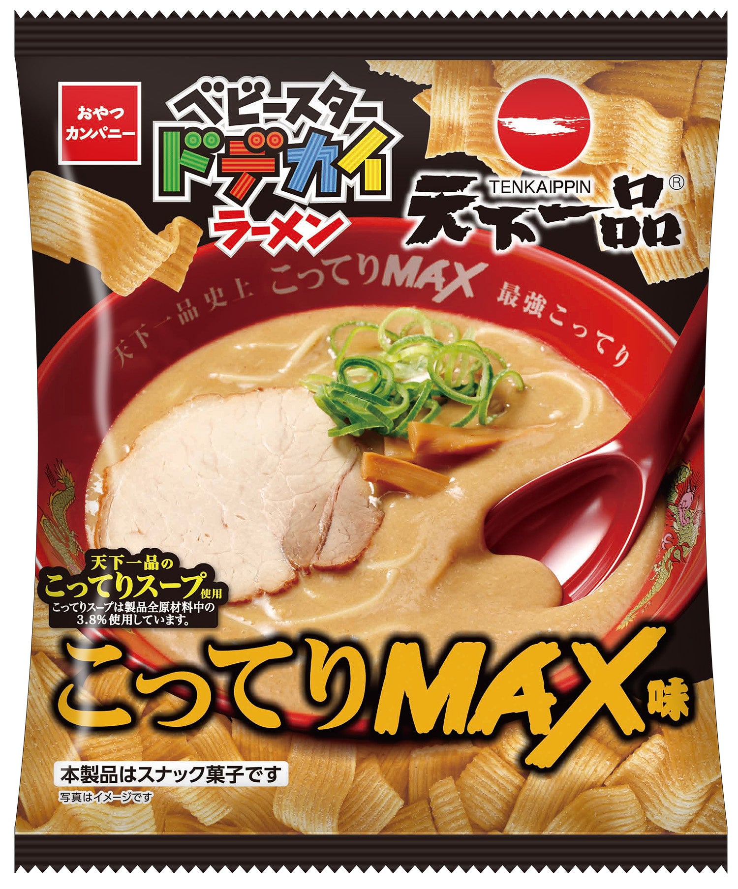 「ベビースタードデカイラーメン(天下一品 こってりMAX味)」は、「こってりMAX」の特徴である、スープにレンゲを沈めるとスープが凹むほどのこってり感をイメージし、実際にお店で使われている“天下一品のこってりスープ”を麺の生地への練り込みと味付けのダブルで使用。「こってりMAX」のスープが絡まった麺を頬張るように、口に入れた瞬間から広がる濃厚感と麺を噛むほどに感じられる旨みを存分に堪能できます。