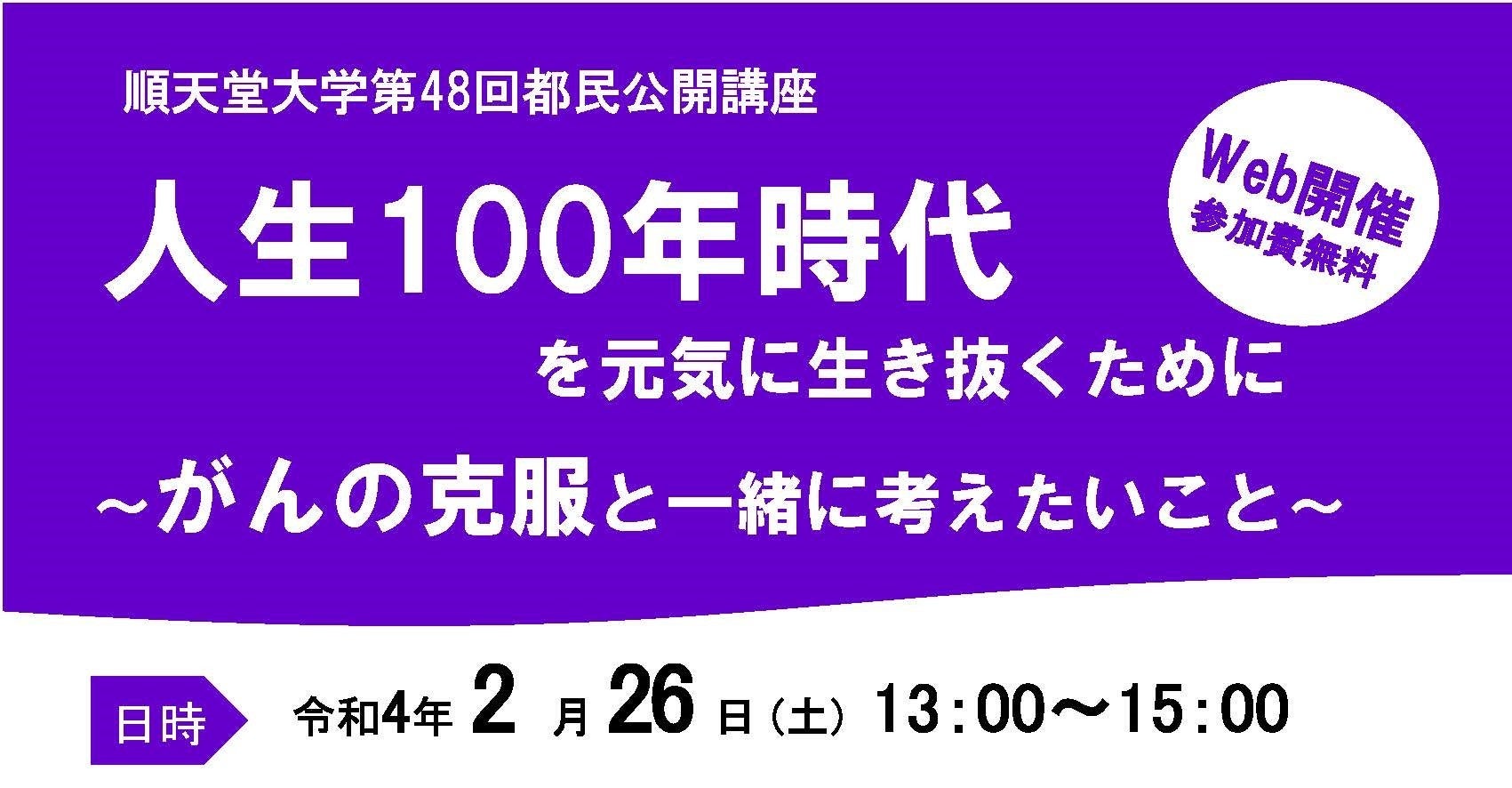 順天堂大学は、2022年2月26日(土)13時より、第48回都民公開講座「人生100年時代を元気に生き抜くために~がんの克服と一緒に考えたいこと~」をオンラインで開催します。