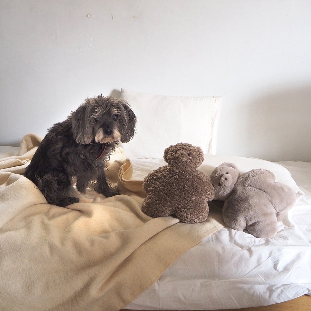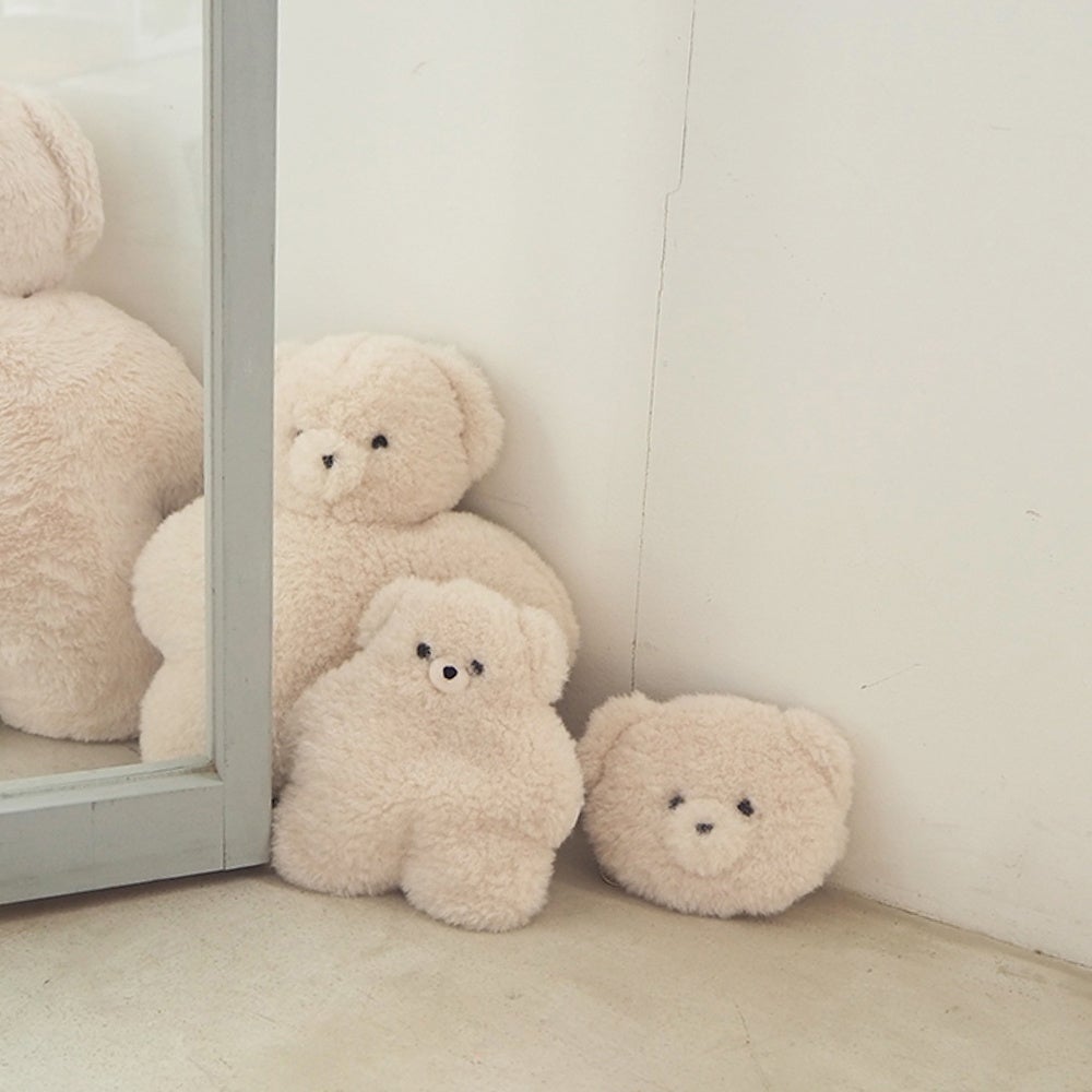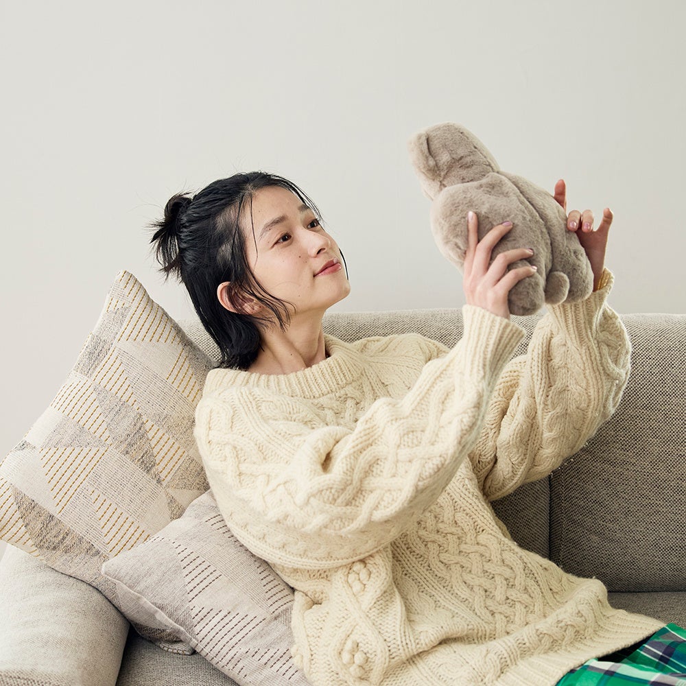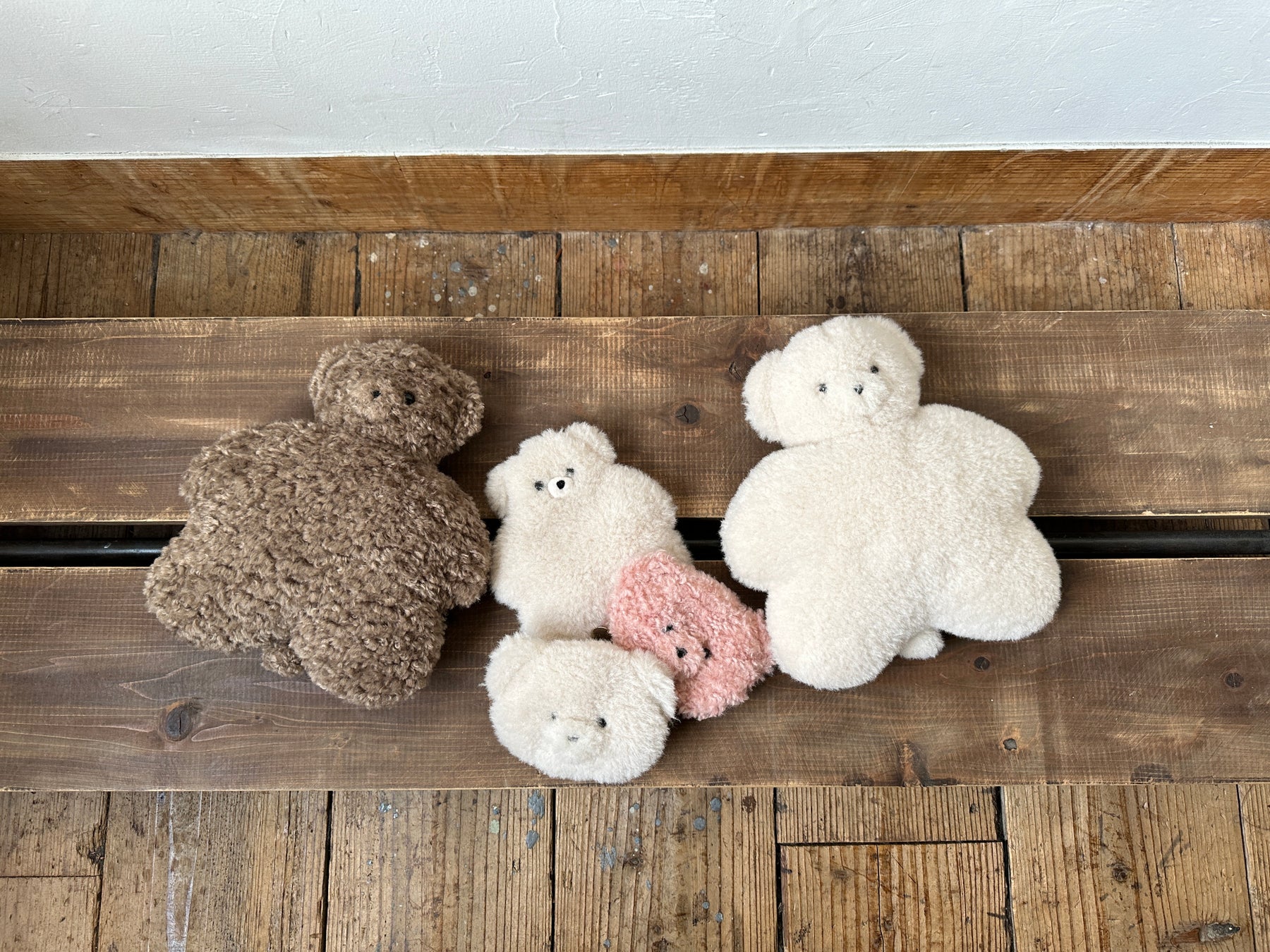 くったりしなる柔らかさと、体のバランスもかわいいMサイズ。手のひらより少し大きめのサイズで、目元にのせたり、肩にのせたり。