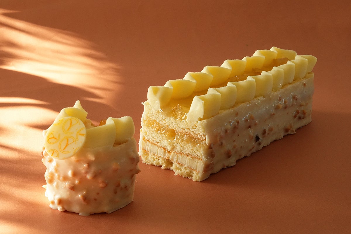 ジェノワーズ⽣地にガナッシュやレモンジュレの層を重ね、アーモンドとホワイトチョコレートでコーティング。上のレモンコンフィがアクセントになったケーキ。