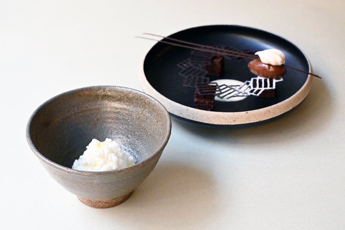 ⽔野 直⼰⽒に師事し、フランスのパティスリーで伝統菓⼦を学んだ「ネル クラフトチョコレート トーキョー」の村⽥⽒と、福知⼭市のレストラン「クーネル」のシェフ ⾜⽴⽒による特別なコラボレーションデセールが楽しめます。