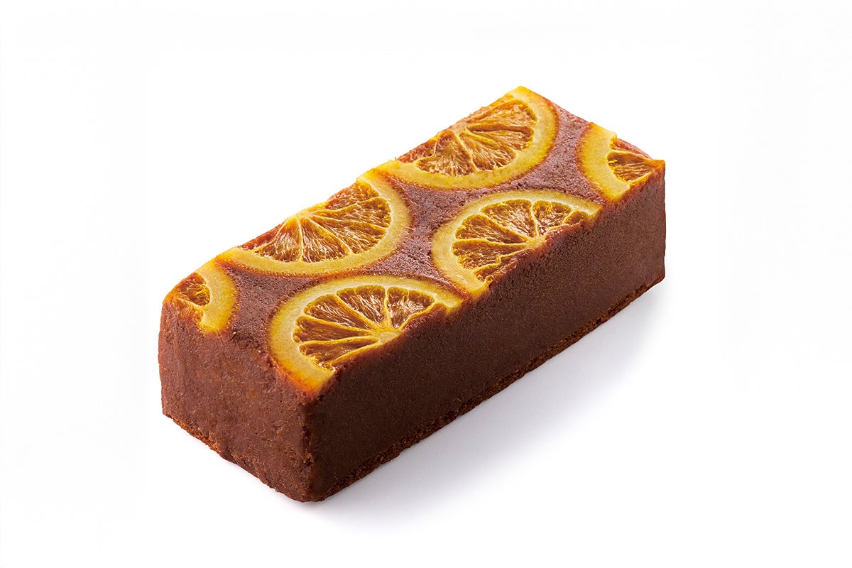 スパイスを効かせたブルトン⽣地の上にオレンジペーストが⼊ったオレンジが主役のチョコテリーヌ。さらにオレンジのコンフィを乗せました。