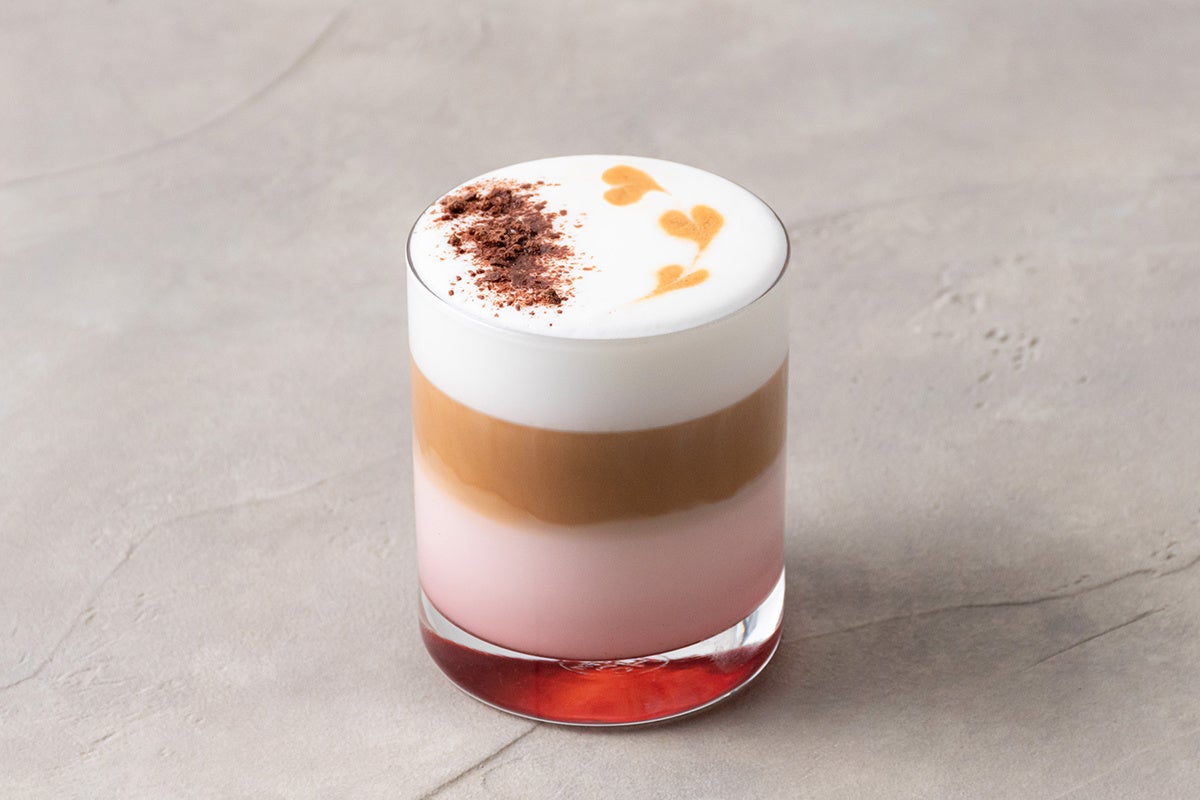 ダークチョコレート⾵味と⾹り⾼いイチゴのフレーバーシロップを使⽤した、ヴェールのような美しさの本イベント限定のカフェラテ。