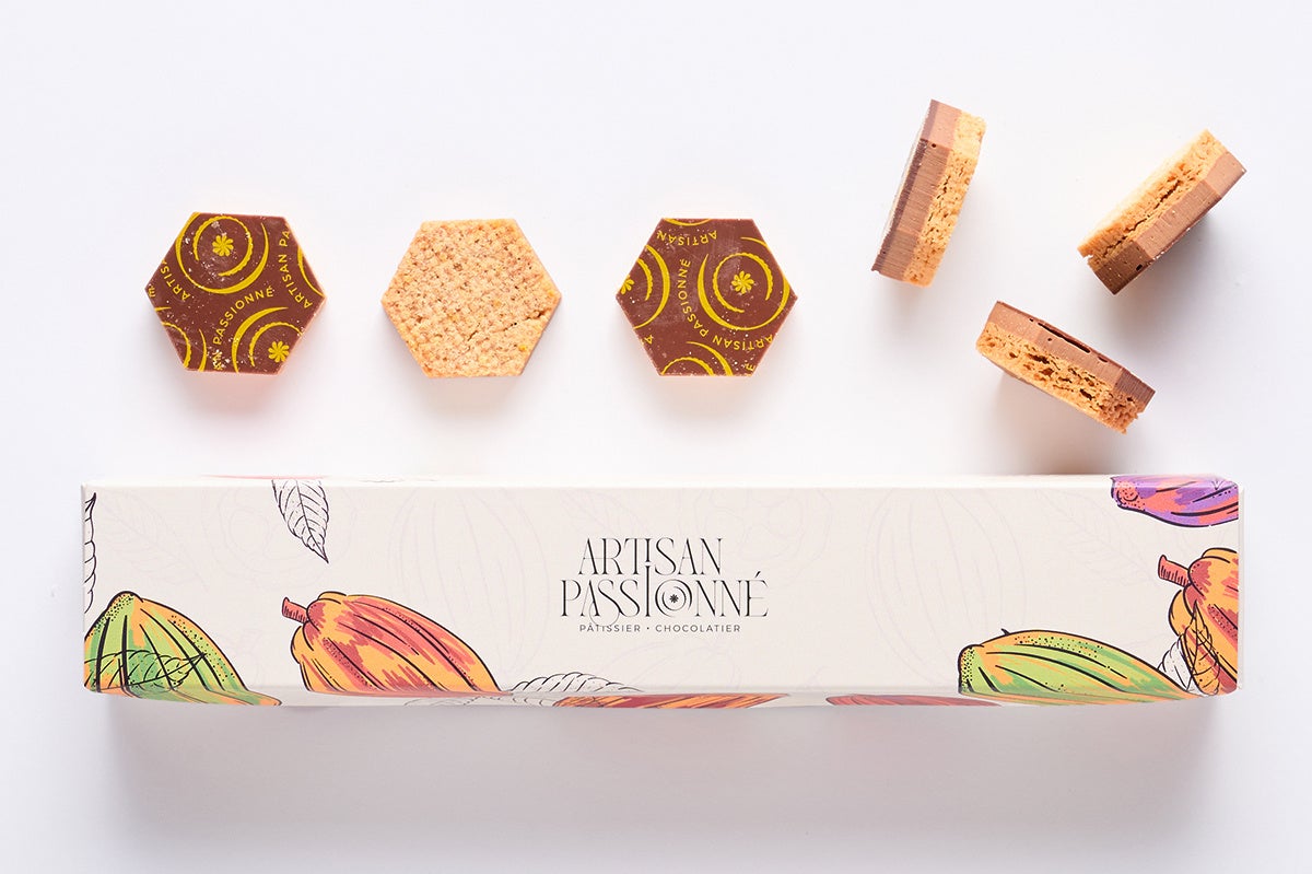 ミニサイズのサブレジャンドゥージャをアソートにした⼀箱。ヘーゼルナッツのジャンドゥージャを、アーモンドのビスキュイとパレショコラでサンドした新作です。
