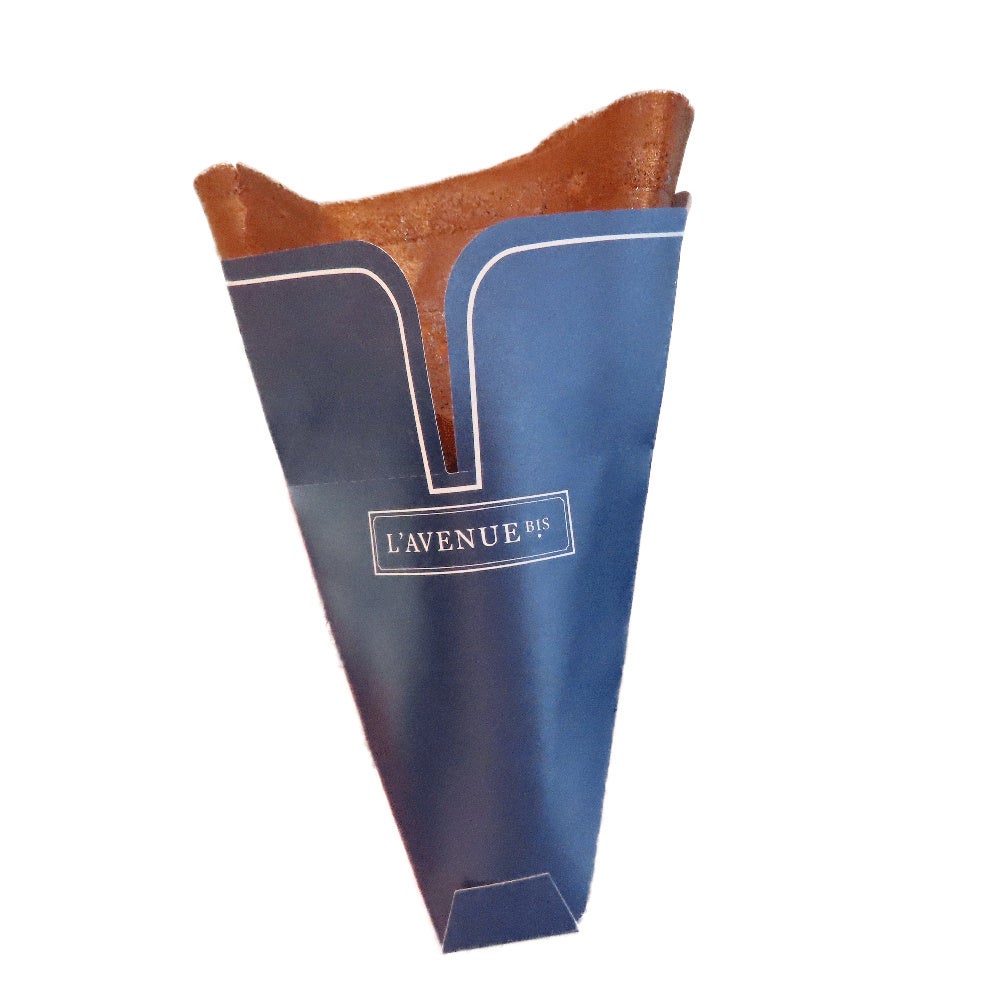 ⾃家製のアプリコット・オレンジのコンフィチュールを包んだクレープショコラ。会場で焼き上げる特製カカオ⽣地の熱々クレープは、外カリッ中フワッの⾷感が楽しめます。ジェイアール京都伊勢丹では初出品です。