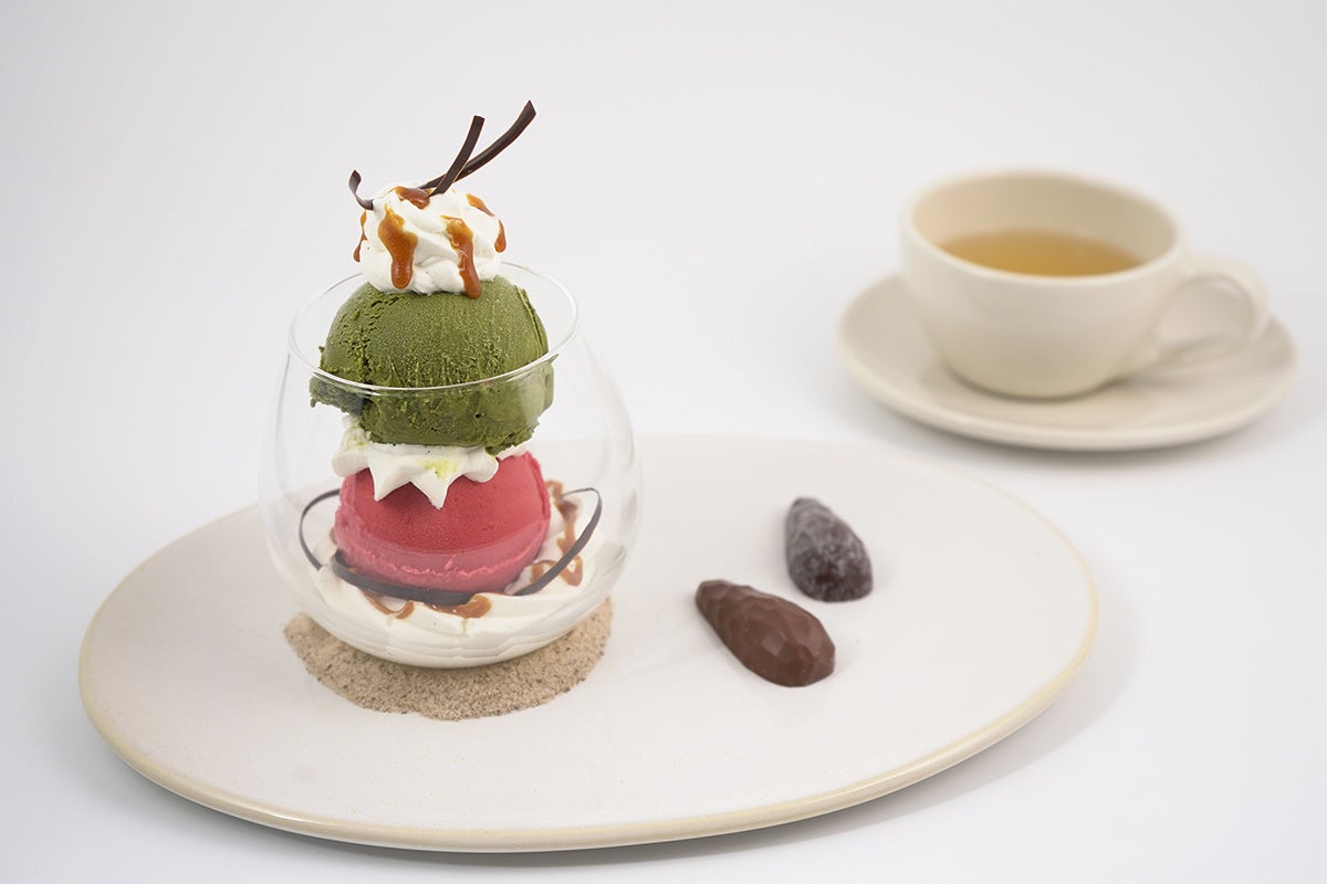 M.O.F.のグラシエ(アイスクリーム職⼈)であるダヴィッド・ヴェスマエル⽒が⼿掛ける塩バターキャラメル「C.B.S.®️」を使⽤したパフェと、ジェイアール京都伊勢丹限定の抹茶アイスクリームとフランボワーズソルベのパフェが登場。