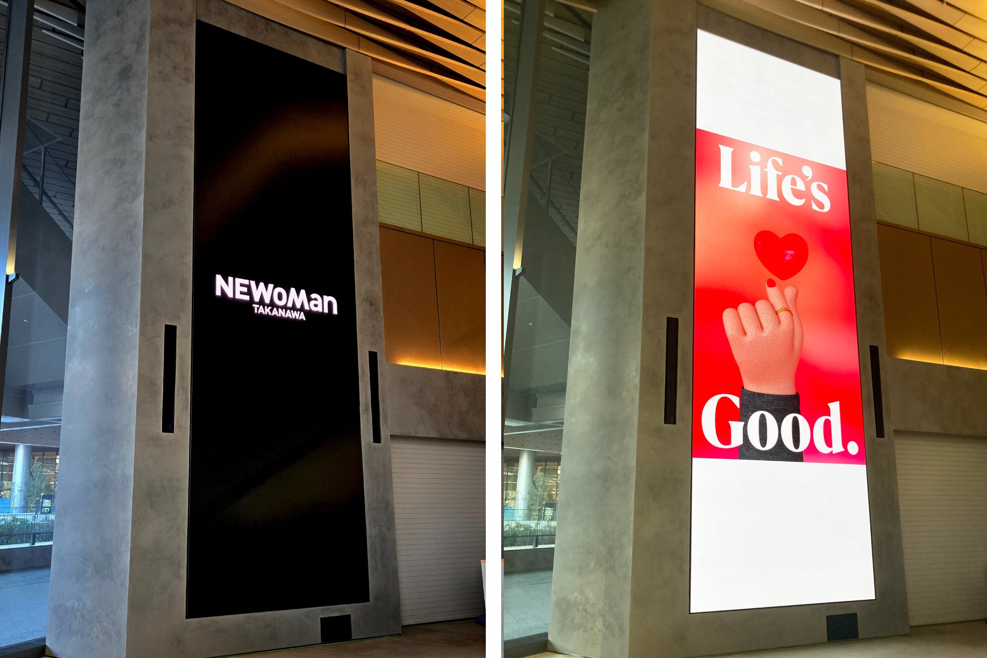 「ニュウマン高輪」のTHE LINKPILLAR 1 NORTHの2階に設置され、高精細かつ迫力あふれる映像で、この度新たに誕生したまちの賑わいを演出します。