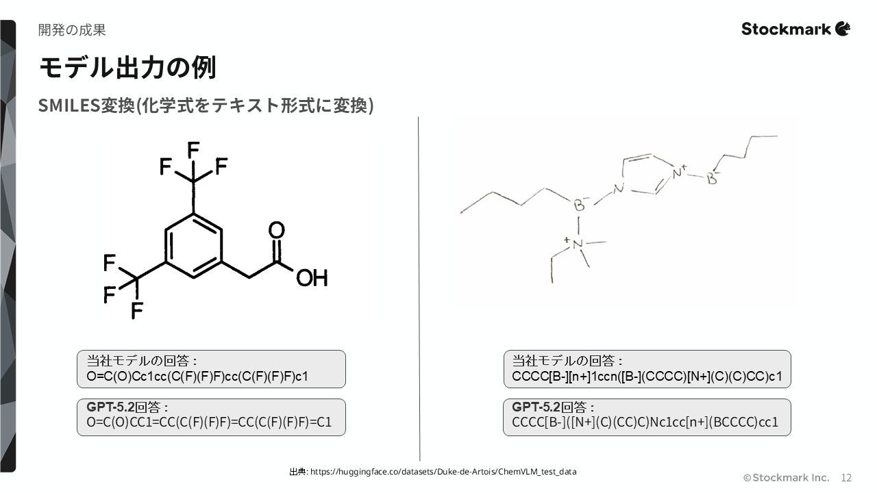 化学構造式をテキスト形式の符号(SMILES)へ変換する際、手書きを含む複雑な図面からでも正確な符号化を実現。フロンティアモデルを凌駕する精度で技術資産のデータベース化を支援します。