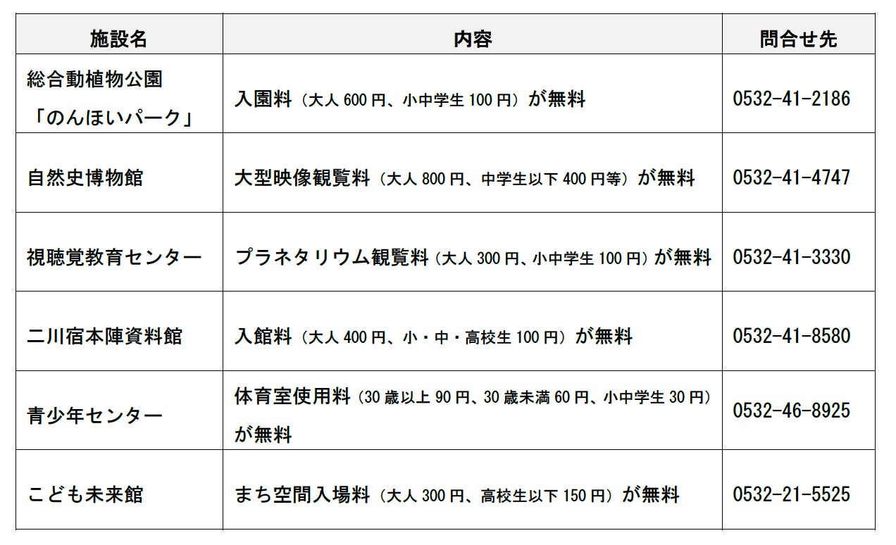 豊橋市では、市立小・中学校とくすのき特別支援学校については11月24日(金)を休み(豊橋市立豊橋高等学校、家政高等専修学校については11月27日(月))とし、これにあわせ11月24日(金)は総合動植物園「のんほいパーク」の入園料や視聴覚教育センターのプラネタリウム観覧料(プラネタリウム特別席は別途座席使用料が必要)等について、全ての来場者の方を対象に無料にします。