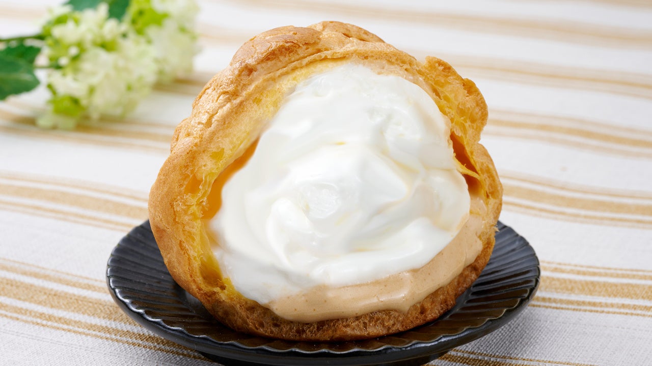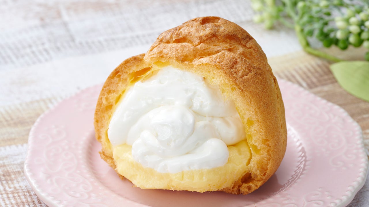 ふんわりとしたパンの中に、カスタード風クリームとホイップクリームが入ったクリームパンです。中の具材が約45%とたっぷり入っています。