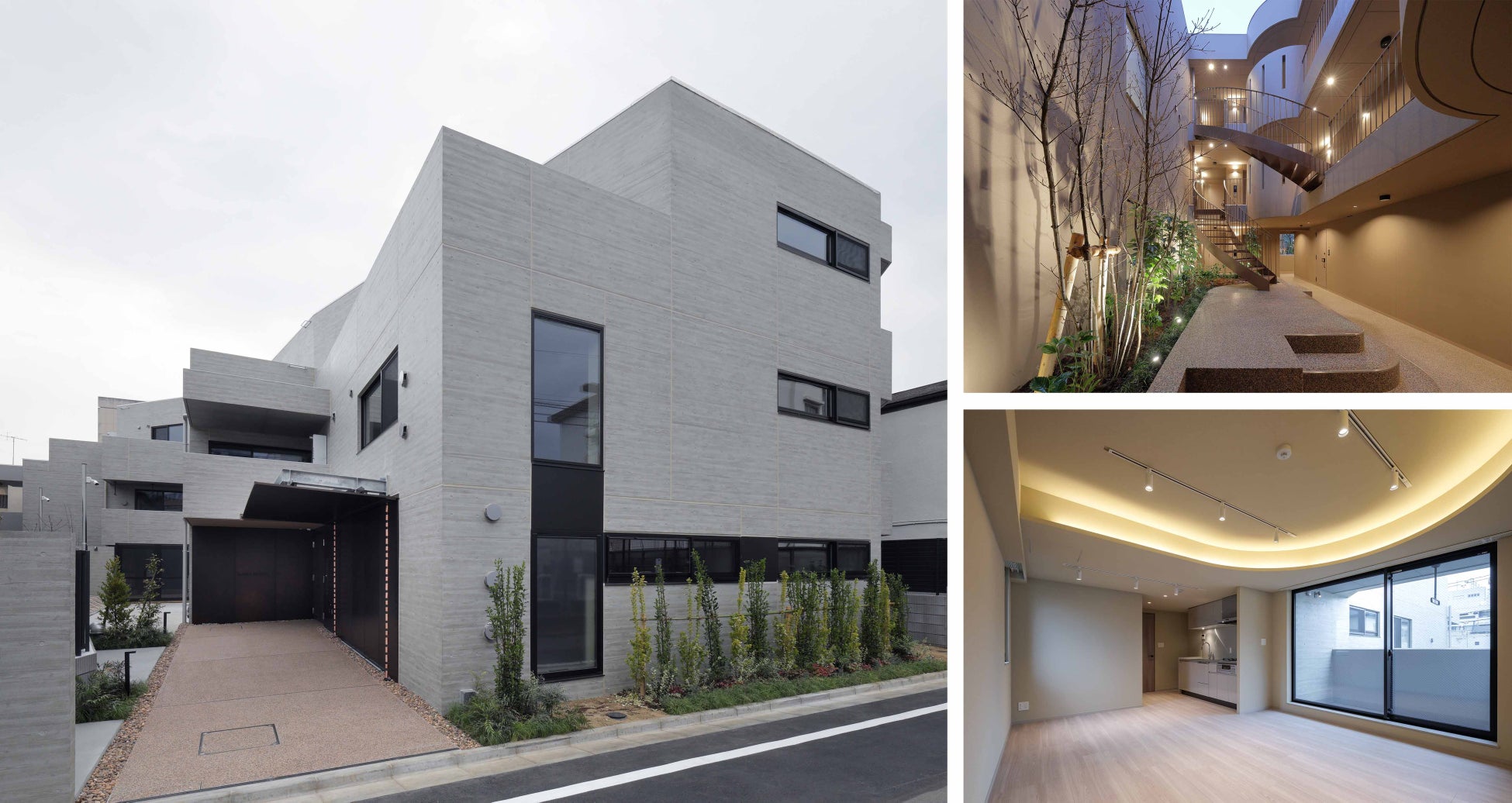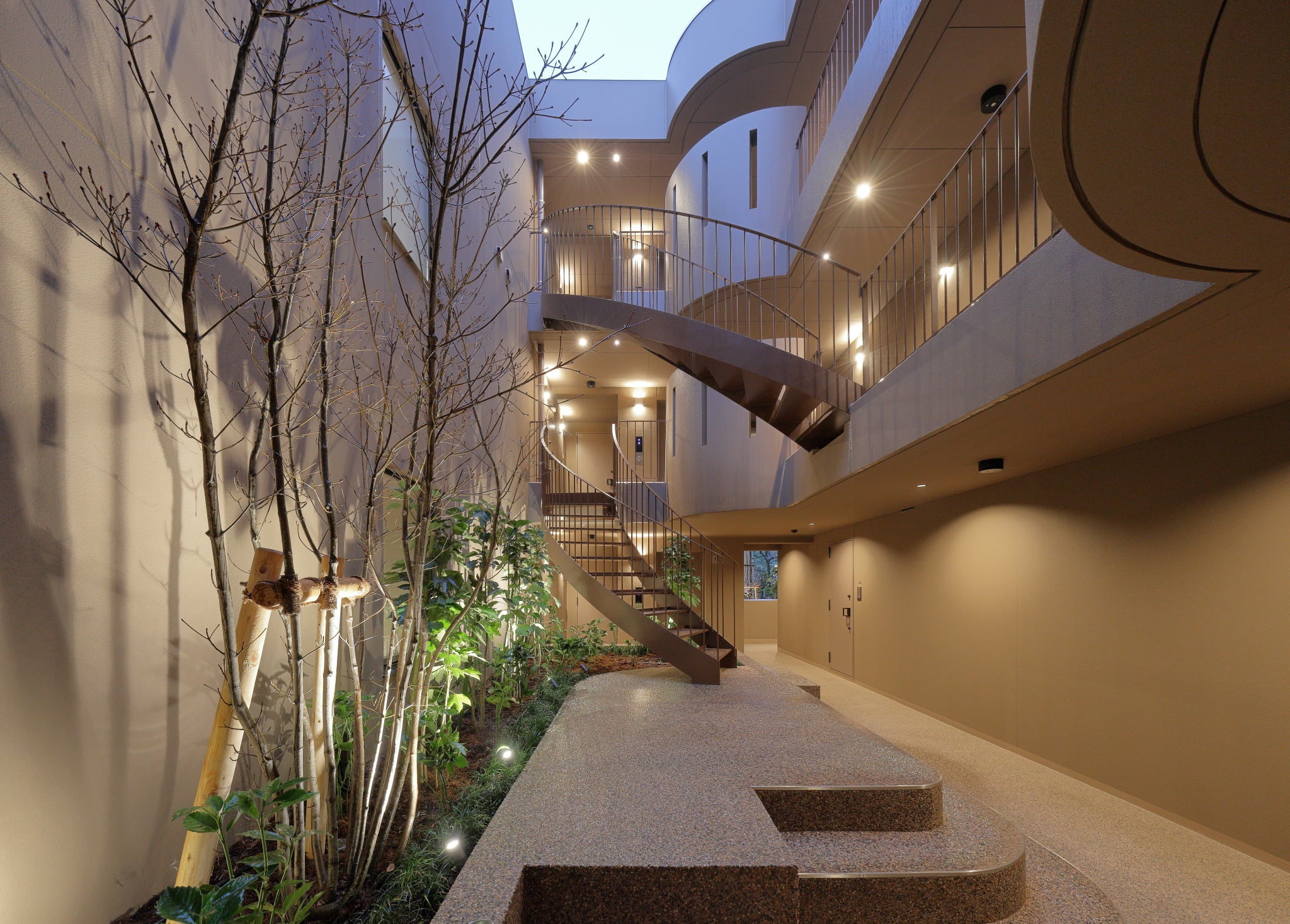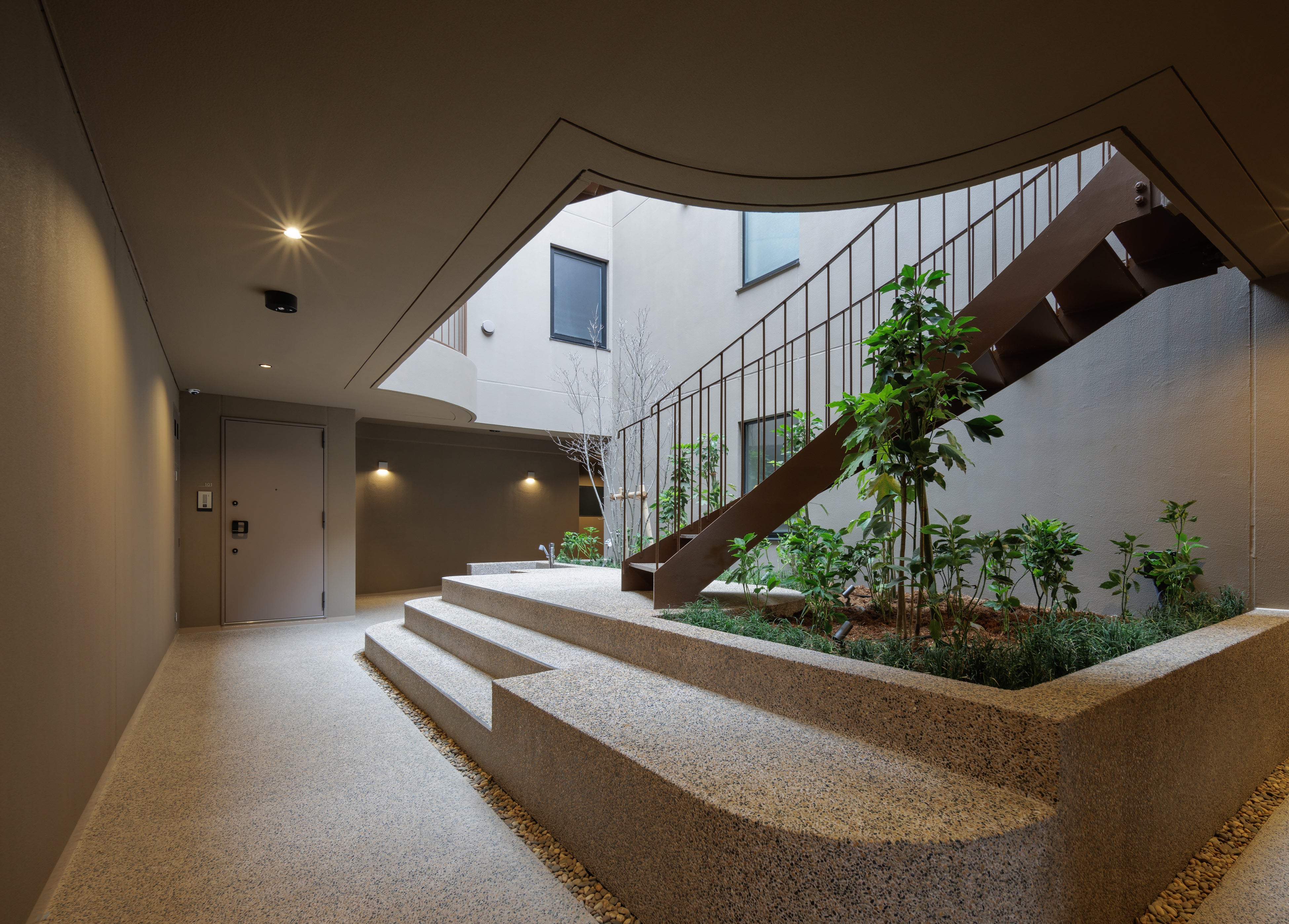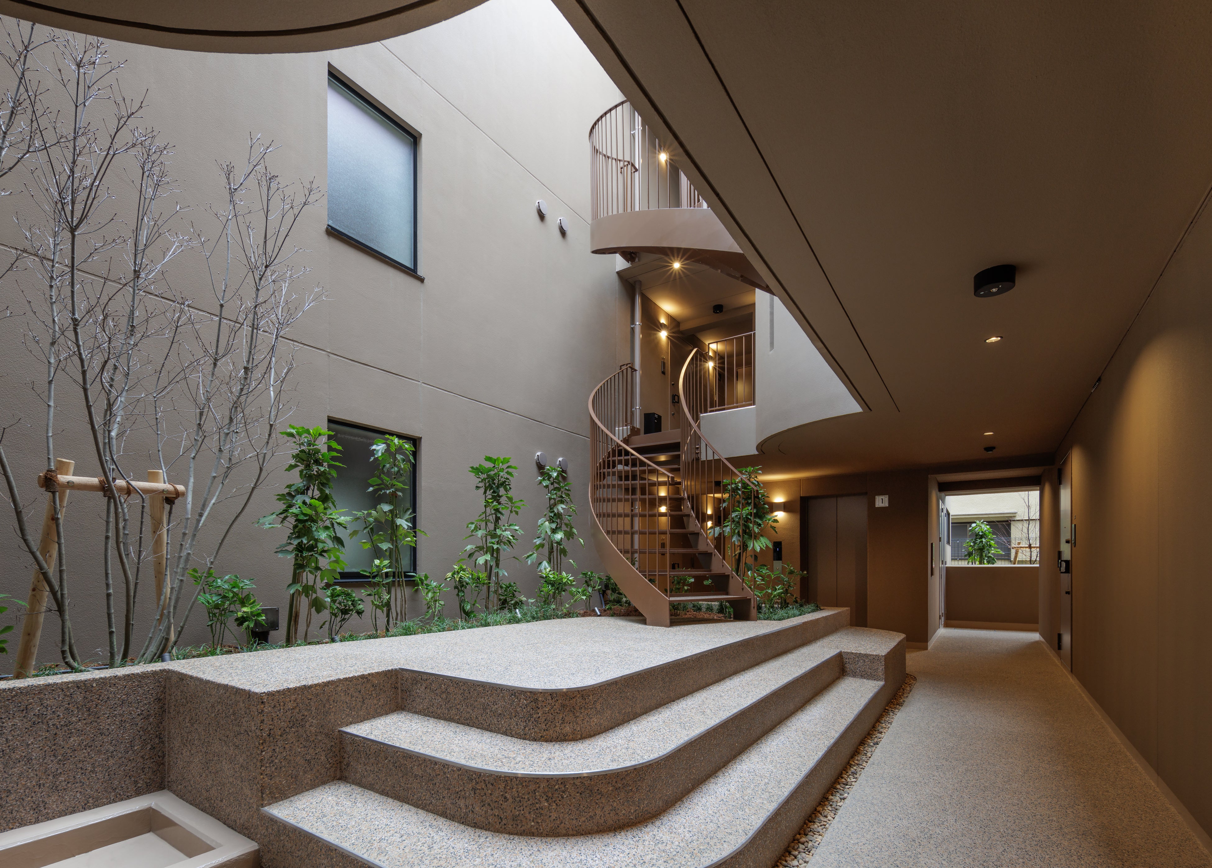 本物件は、株式会社アラキ+ササキアーキテクツとhiro nakata atelierの設計です。扇形の敷地形状を生かし、入口を抜けて奥へ進むと空間が大きく広がり、中央には曲線を描く階段が印象的な中庭を配置しています。外部からは想像できない開放的な内部空間が現れ、洞窟のような奥行きとワクワク感を備えた住環境を創出しています。