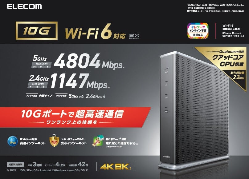 エレコム株式会社(本社:大阪市中央区、取締役社長:柴田幸生)は、インターネット回線側に10Gポートを搭載し、Wi-Fi 6に対応した、Wi-Fi 6対応ルーターのハイエンドモデル“WRC-X6000XS-G”を新発売いたしました。