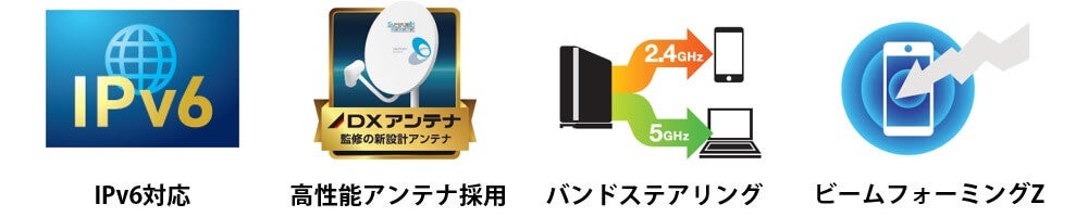 回線が混雑しにくいIPv6 IPoEインターネット接続に対応し、快適な通信が可能です。インターネットポートにLANケーブルを接続するだけですぐにインタ―ネットが使えます。グループ会社であるDXアンテナのノウハウを活かした内蔵アンテナを搭載し、すっきりした見た目ながら快適な通信、家のどこにいても安定した接続が可能です。「バンドステアリング機能」を搭載し、より快適な帯域(5GHz/2.4GHz帯)を自動で選択・接続します。集中して電波を送信する「ビームフォーミングZ」により、iPhone やAndroid などの対応する端末では、離れた場所でも快適につながります。機能によっては接続相手の端末も同様の機能に対応している必要があります。