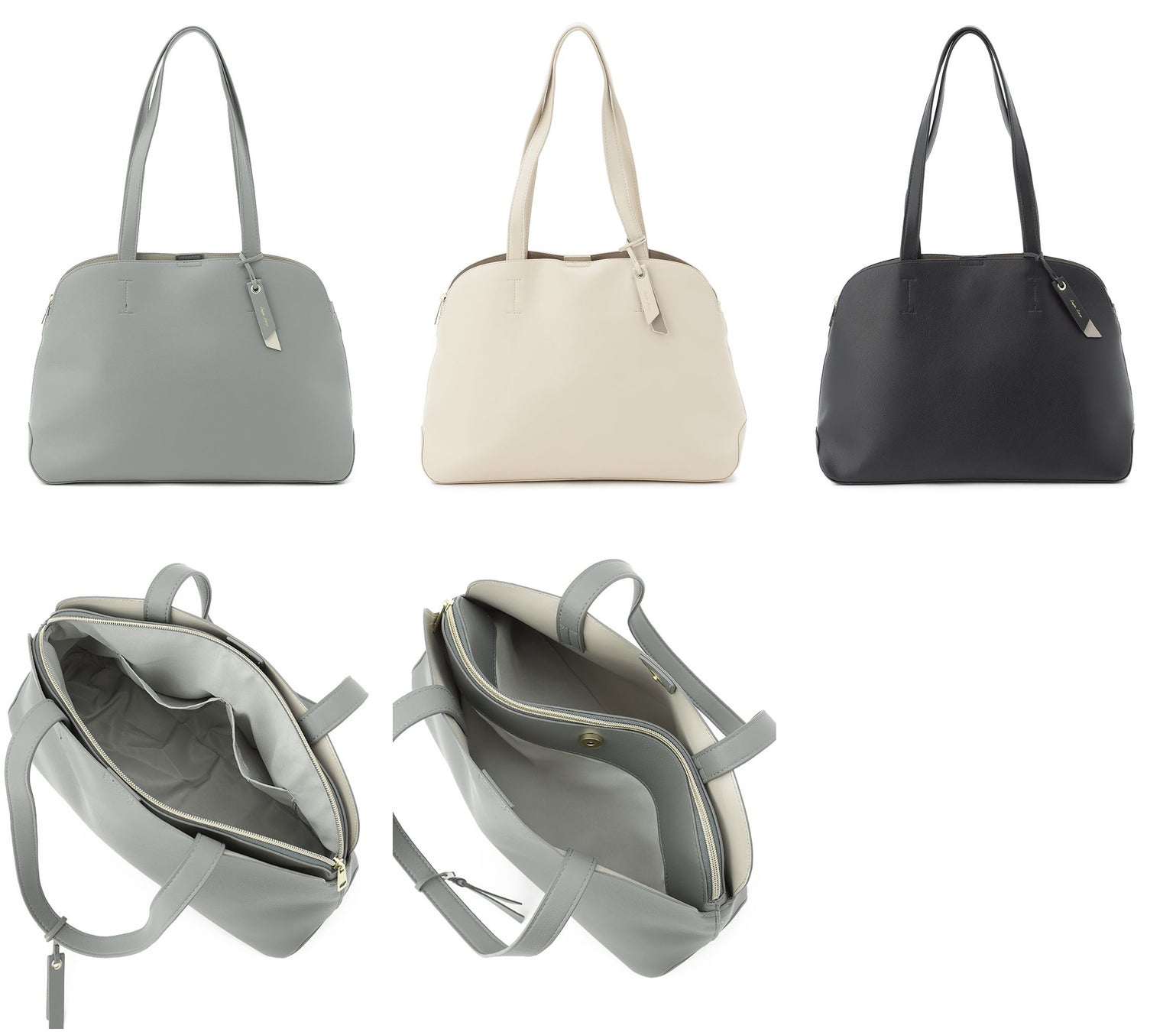 ベーシックなデザインのトートバッグは、丸いフォルムが優しい印象に。490gの軽量で持ち手が長めのため、持ち運びラクラクなバッグです。かっちりしたスタイルに合うブラックと春らしいブルー、フェミニンなホワイトの3色展開です。A4サイズ対応可能な収納力と、3つに分かれスペースで書類や小物などを分けて収納ができるバッグです。