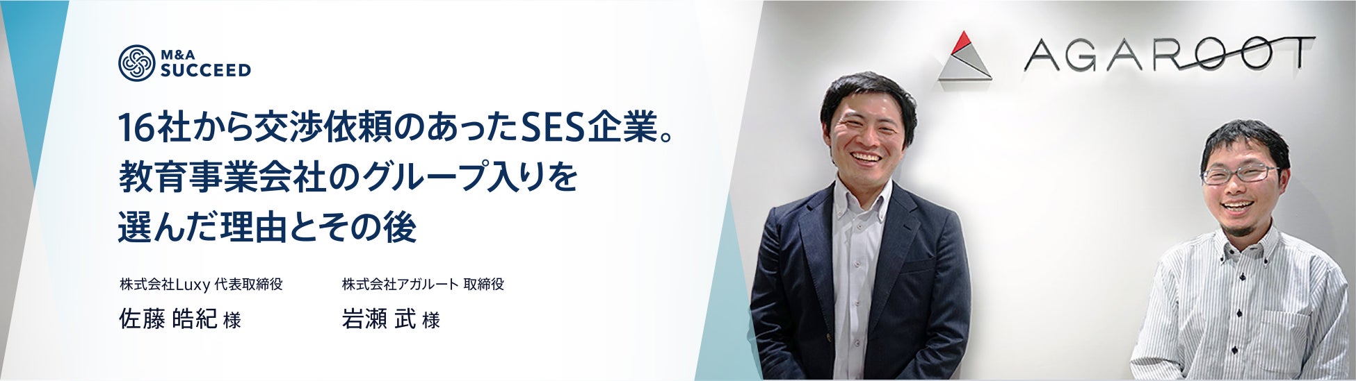 Visionalグループの株式会社M&Aサクシード(所在地:東京都渋谷区/代表取締役社長:金 蓮実)が運営する法人・審査制M&Aマッチングサイト「M&Aサクシード(旧ビズリーチ・サクシード)」(https://ma-succeed.jp/)は、「M&Aサクシード」経由で、株式会社アガルート(所在地:東京都、以下アガルート)が、事業成長のためM&Aを選択肢の一つとして検討していたSES(システムエンジニアリングサービス)企業を譲り受けたことをお知らせします。国内最大級の難関資格試験オンライン講座などを運営するアガルートが譲り受けたのは、約40名のエンジニアを擁する株式会社Luxy(所在地:東京都、以下:Luxy)です。これにより、Luxyは、SES事業だけでなく、グループ会社のシステム開発領域にも事業を拡大しています。また、アガルートは、Luxyを譲り受けることで、自社でシステム開発が可能になり、さらに事業成長スピードを上げることができます。