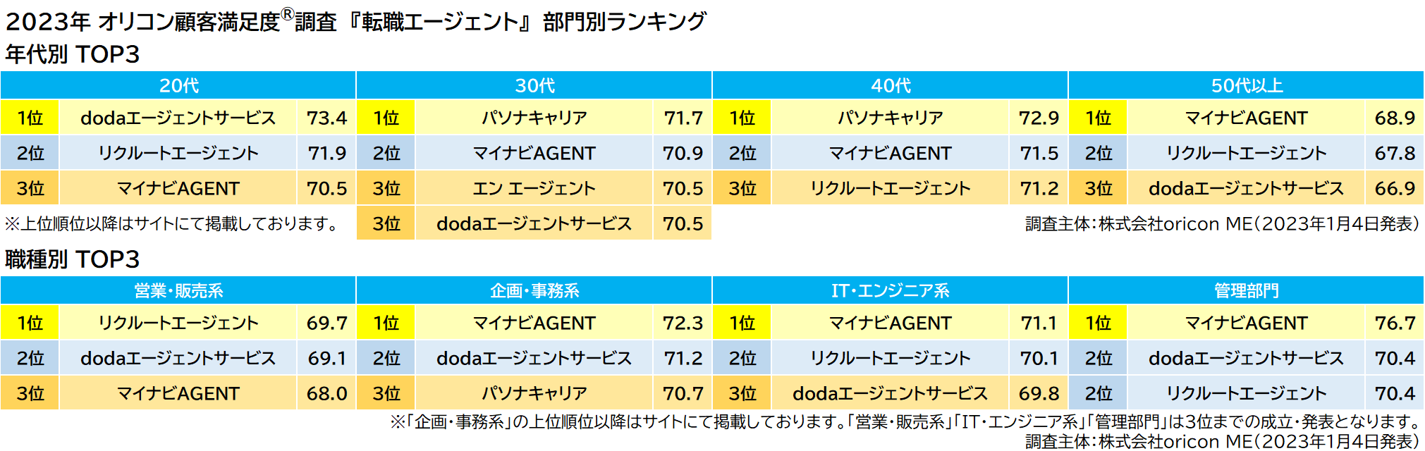 実際のサービス利用者を対象に第三者の⽴場で顧客満⾜度調査を実施する株式会社oricon ME(本社:東京都港区 代表取締役社⻑:⼩池恒 略称:オリコン)は、『転職エージェント』『ハイクラス・ミドルクラス転職』『看護師転職』についての満⾜度調査を実施し、1⽉4⽇(水)14時にその結果を「オリコン顧客満⾜度® 」公式サイト内( https://life.oricon.co.jp/ )にて発表いたしました。結果は以下の通りとなりました。