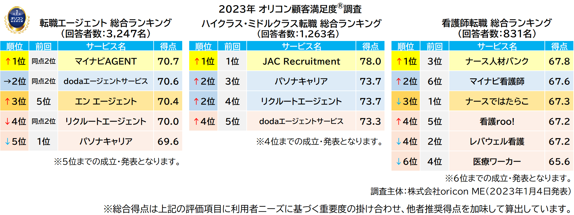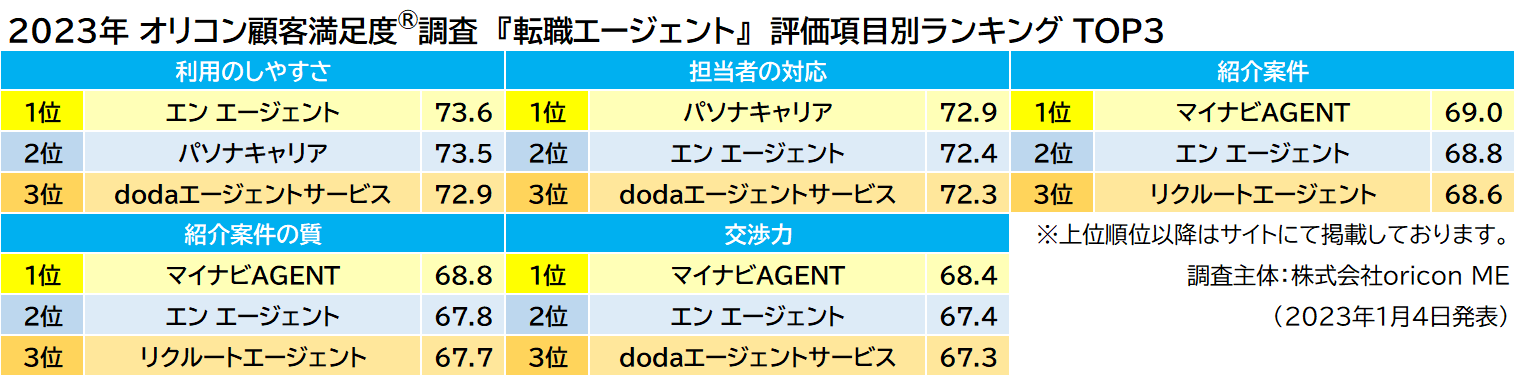 実際の利用者5,341名が評価した 『転職エージェント』 『ハイクラス・ミドルクラス転職』 『看護師転職』 ランキング(2023年 オリコン顧客満足度®調査)