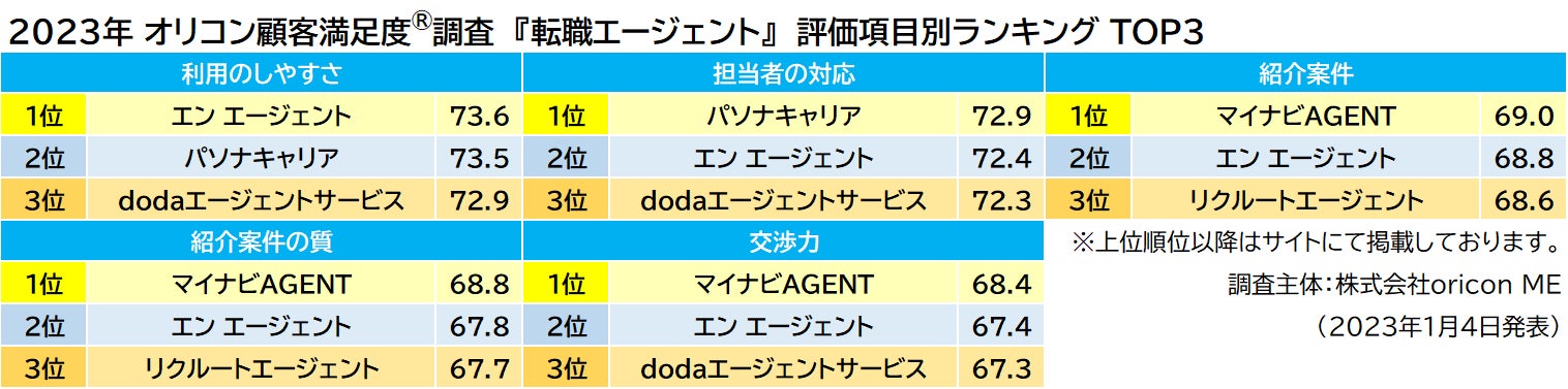 つづいて総合2位は【dodaエージェントサービス(パーソルキャリア株式会社 本社:東京都千代田区)】がランクイン。年代別「20代」では前回に続いて2年連続の1位を獲得しました。総合3位は【エン エージェント(エン・ジャパン株式会社 本社:東京都新宿区)】。評価項目別「利用のしやすさ」で1位の評価を得ています。