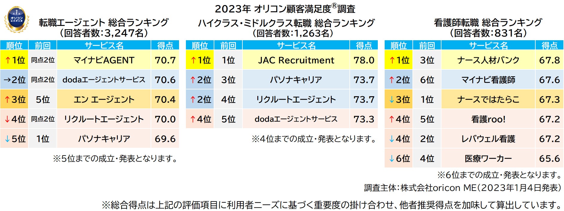 転職エージェントは【マイナビAGENT】が初の総合1位獲得、ハイクラス・ミドルクラス転職は【JAC Recruitment】が5年連続総合1位、看護師転職は【ナース人材バンク】が初の総合1位獲得