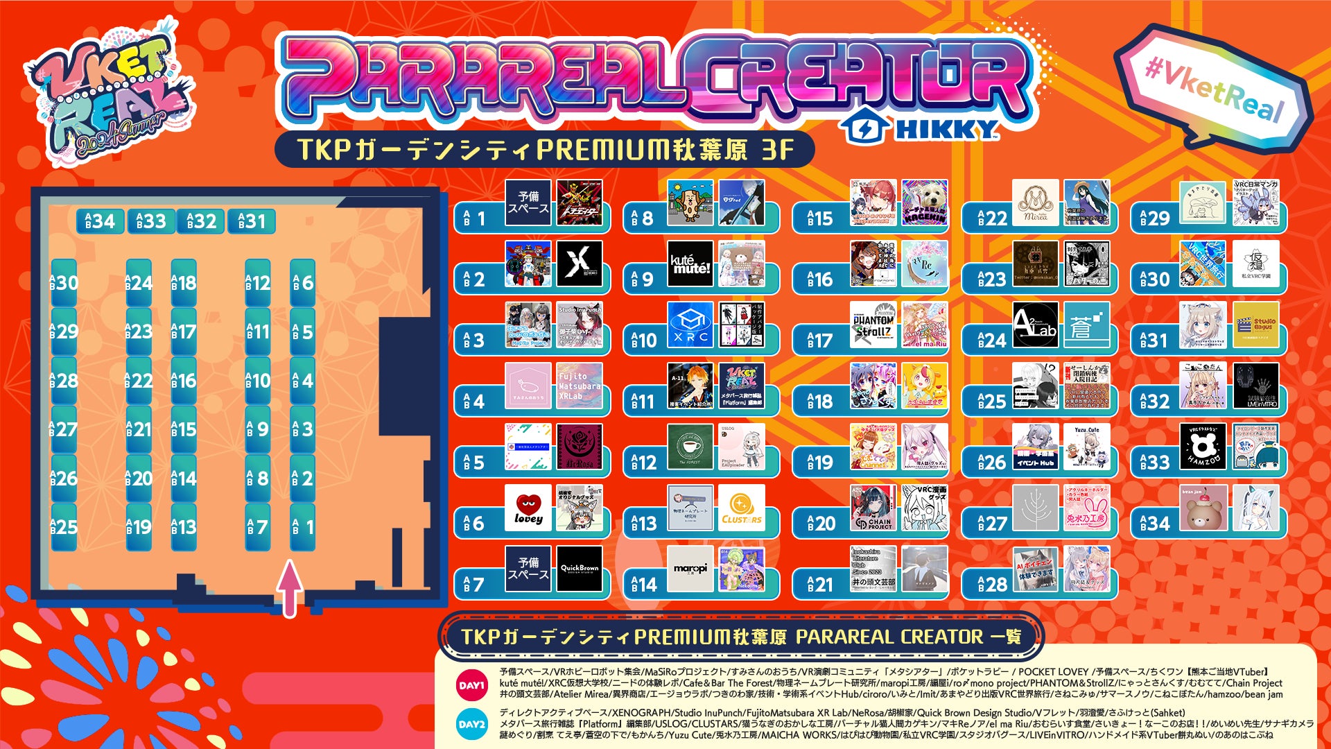 パラリアルクリエイターのブース配置図と出展サークルが確定しました。ブース数は「TKPガーデンシティPREMIUM秋葉原」で3日に32ブース、4日に34ブースが出展。「難波御堂筋ホール」には3日に19ブース、4日に18ブースが出展します。毎回多数の方が来場し盛り上がるパラリアルクリエイターエリアをお楽しみください。