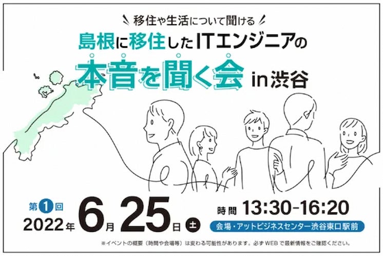 島根県は、全国で活動するITエンジニアを対象に、島根県への移住・転職を支援するイベント「島根に移住したITエンジニアの本音を聞く会」を令和4年6月25日(土)に東京で開催します。