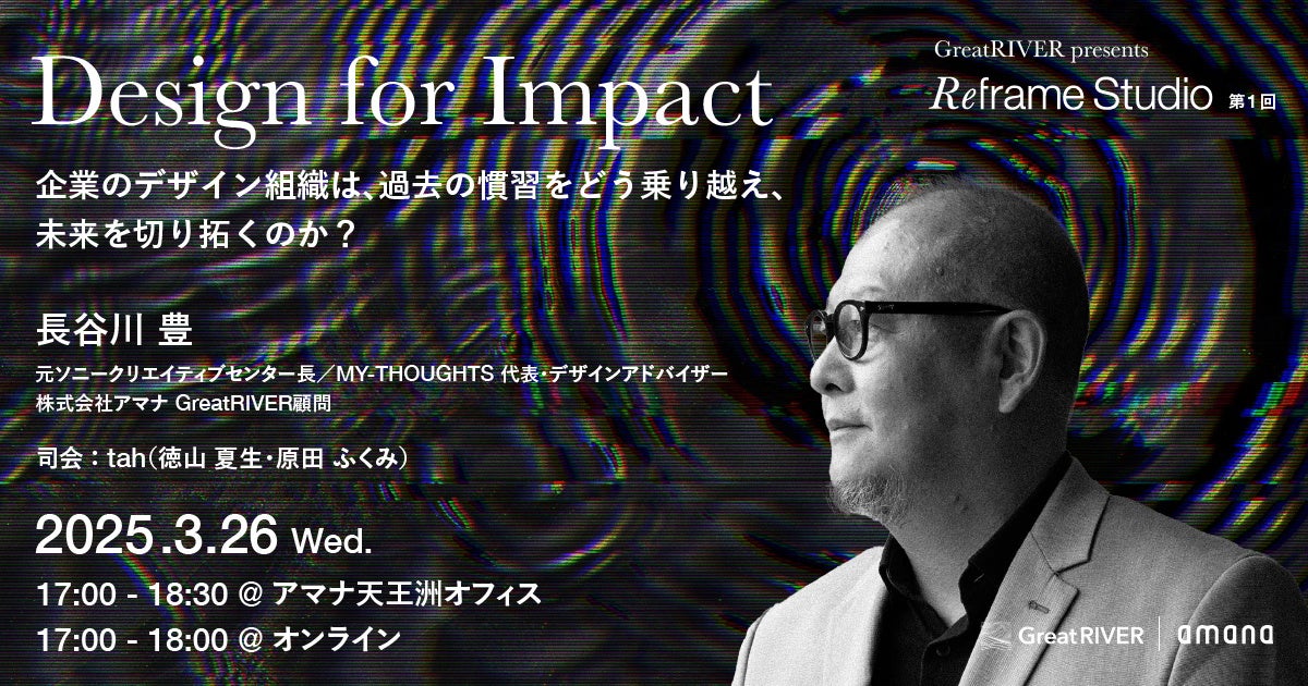 コミュニケーション変革をクリエイティブで実現する株式会社アマナ(本社:東京都品川区、代表取締役社長:金子剛章、以下「アマナ」)は、2025年3月26日(水)、「Design for Impact|企業のデザイン組織は、過去の慣習をどう乗り越え、未来を切り拓くのか? Great RIVER presents〈Reframe Studio〉第1回」をテーマにハイブリッドセミナーを開催します。