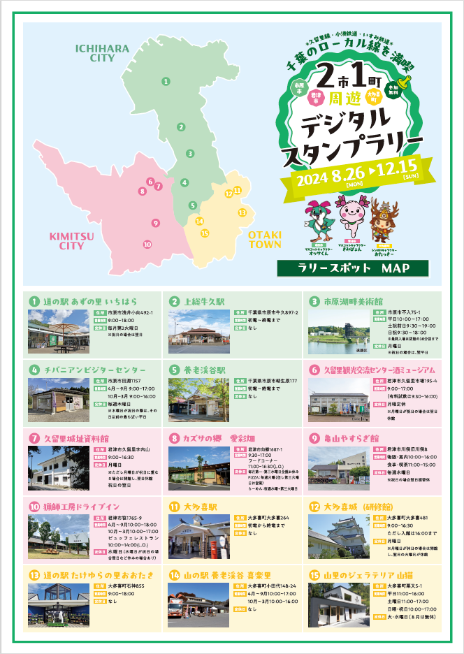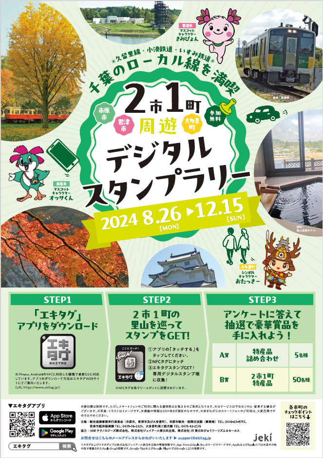 ◎株式会社ジェイアール東日本企画が提供する駅スタンプアプリ「エキタグ」では、2024年8月26日(月)から2024年12月15日(日)の期間に千葉県市原市・君津市・大多喜町で「2市1町周遊デジタルスタンプラリー」を開催!