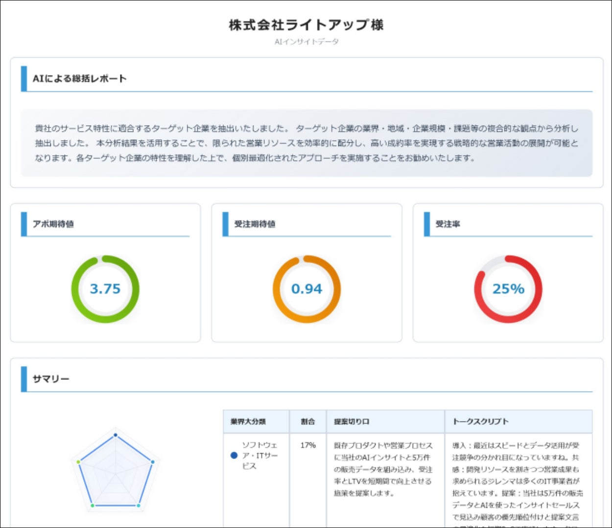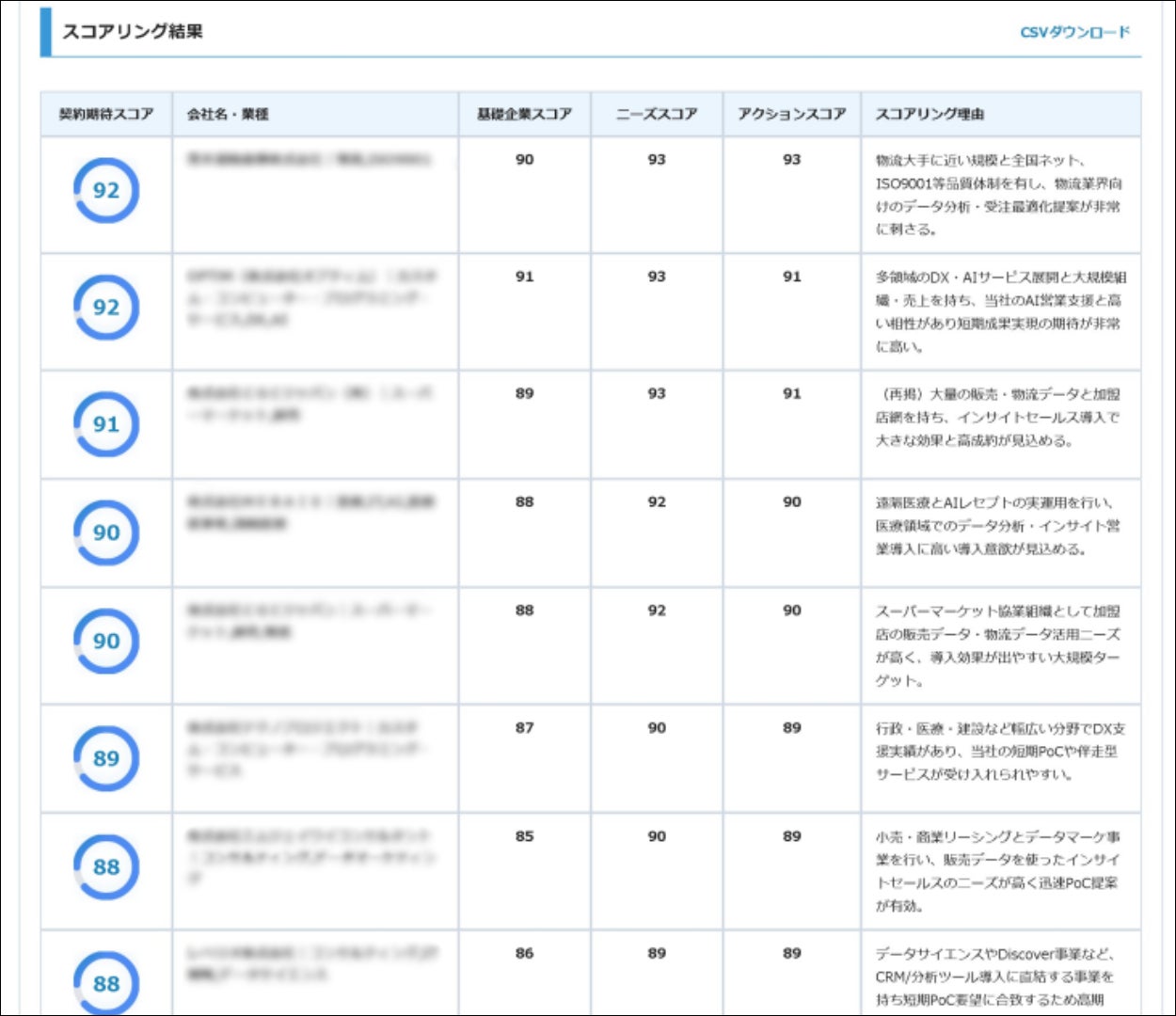 ペルソナに合致する企業をデータベースから抽出し、全体サマリーとともに、AIが算出したスコアリングされた企業リストが出力されます。