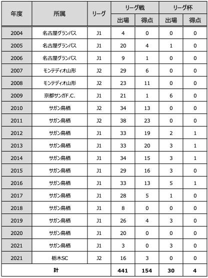J1リーグ 301試合(98得点) / J2リーグ 140試合(56得点)