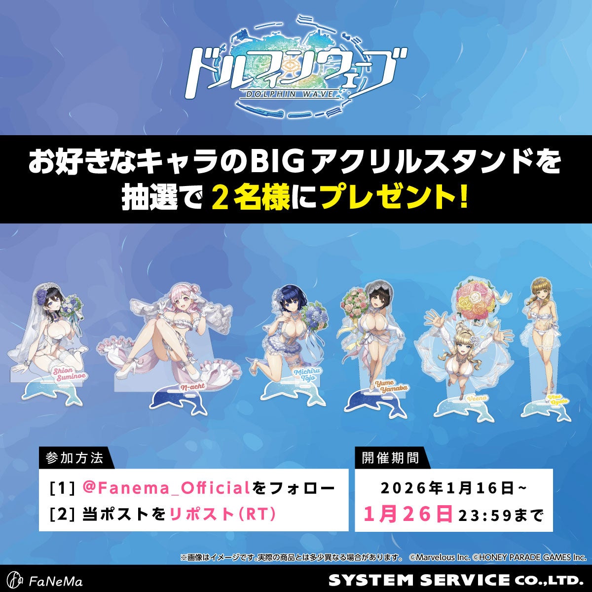 システムサービス株式会社(本社:東京都豊島区、代表取締役社長:田村宗弘)は、アニメ・マンガ・ゲーム作品等のキャラクター商品の企画・製作・販売をする自社ECサイト「FaNeMa」(URL:https://fanema.jp/)にて、『ドルフィンウェーブ』より「BIGアクリルスタンド」「マルチデスクマット」を発売いたします。