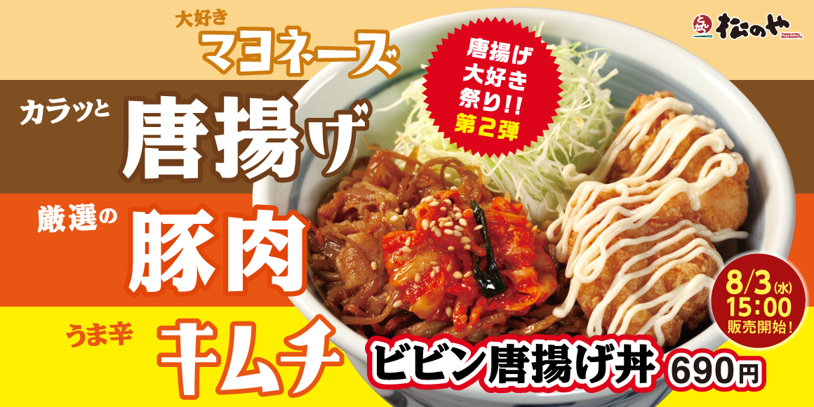 株式会社松屋フーズ(本社:東京都武蔵野市、代表取締役社長:瓦葺 一利)では、とんかつ専門店の「松のや・松乃家」におきまして、2022年8月3日(水)午後3時より、「ビビン唐揚げ丼」を発売いたします。