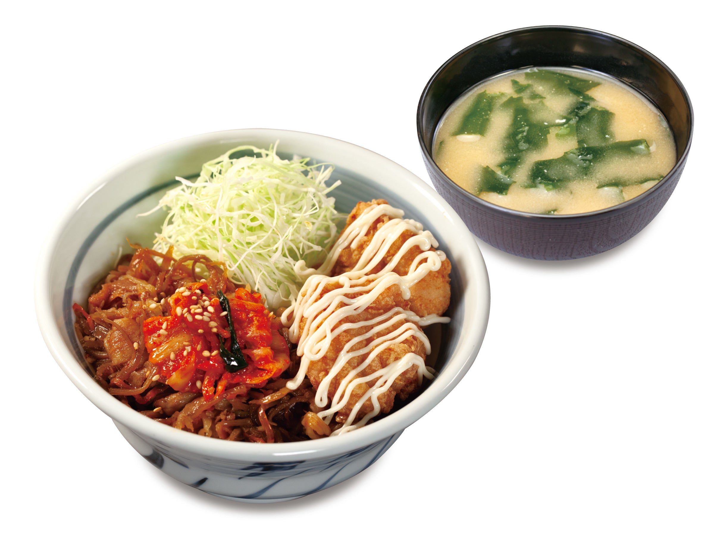 松屋ロングセラーの「豚ビビン丼」と、マヨネーズ×唐揚げが両方楽しめる欲張り丼