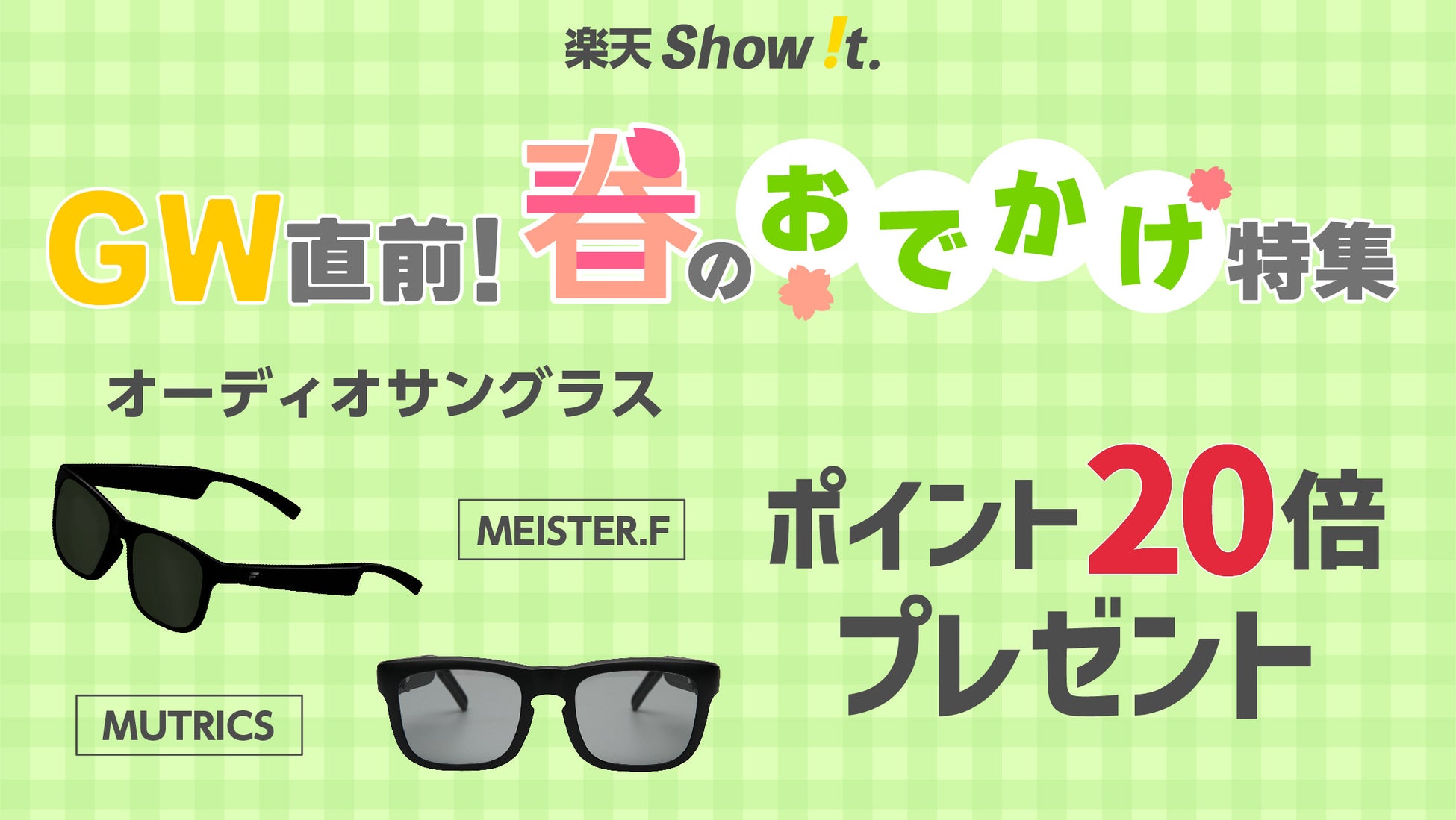 楽天「Show !t」は4月9日(日)から、周囲の環境音を聞きながら音楽や通話・ナビが聞けるオーディオサングラス2種類どちらかご購入のお客様にポイント20倍プレゼント。さらに4月9日(日)20時~4月16(日)01時59分まで全商品ポイント10倍プレゼント・送料無料になる楽天お買い物マラソンに参加します。