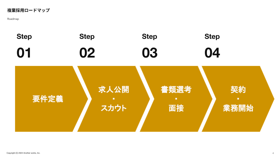 複業採用のロードマップを「要件定義」「求人公開・スカウト」「書類選考・面接」「契約・業務開始」の4つのステップに分け、それぞれのフェーズにおいて確認すべきポイントをチェックリストにまとめました。