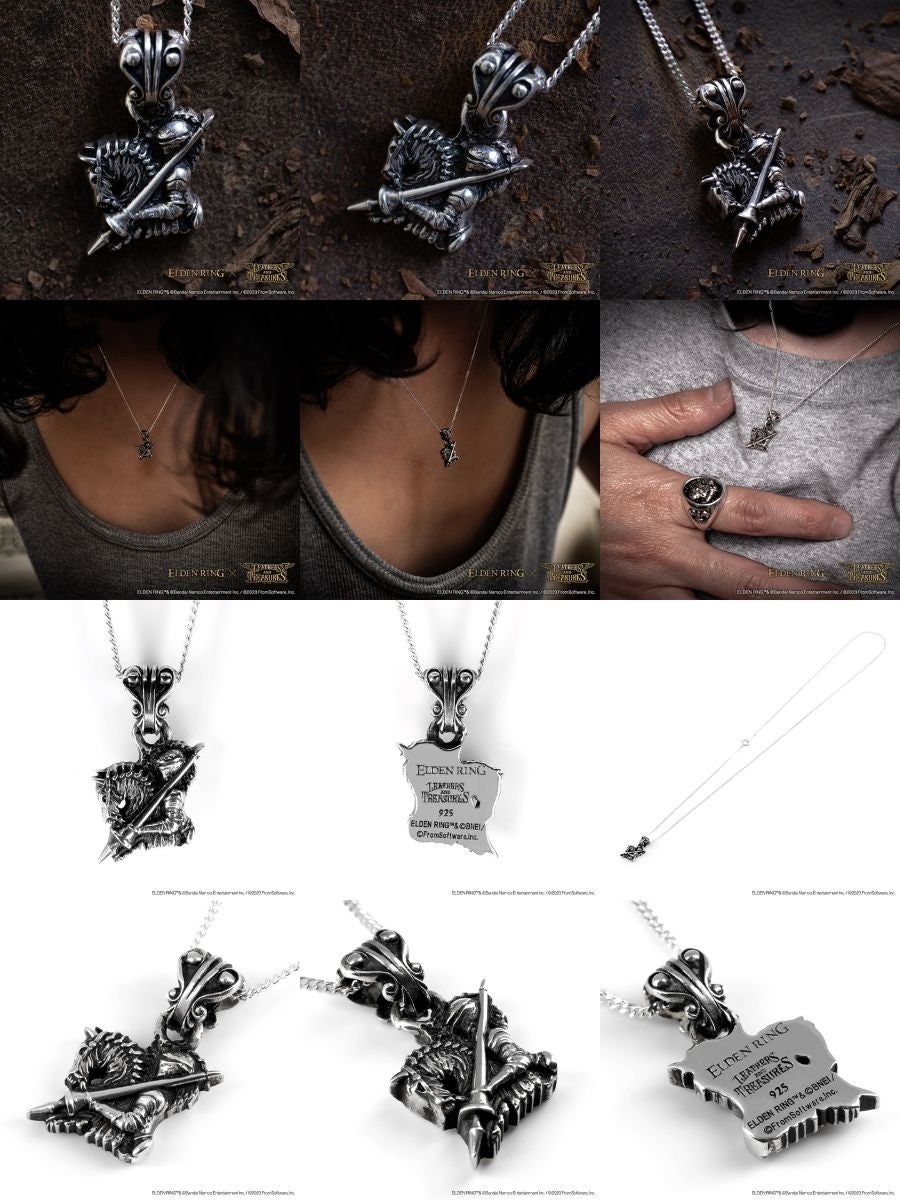 トレントに乗る機会が多いプレイヤーの多くが装備したはずの「ランスのタリスマン」。特徴的な、馬にまたがりランスを掲げた鎧騎士のデザインは、まさにエルデンリングに登場するアイテム「ランスのタリスマン」そのもの。シルバーに燻加工を施し、敢えて古めかしい雰囲気を表現したネックレス(チェーン付きチャーム)です。