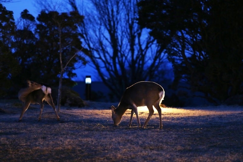 ホテル周辺を散策する「ナイトウォーク」では、敷地内に生息する鹿の家族に出会えることもあります
