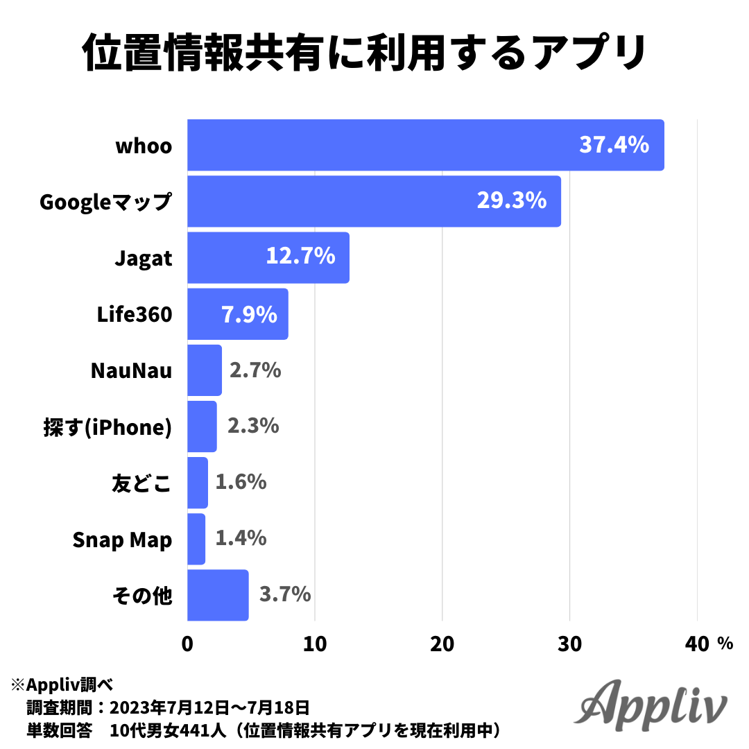 現在利用中と回答した441人に、位置情報を共有する際に利用するアプリを尋ねたところ、最も多かったのは『whoo(フー)』で37.4%、2位は『Google マップ』29.3%でした。