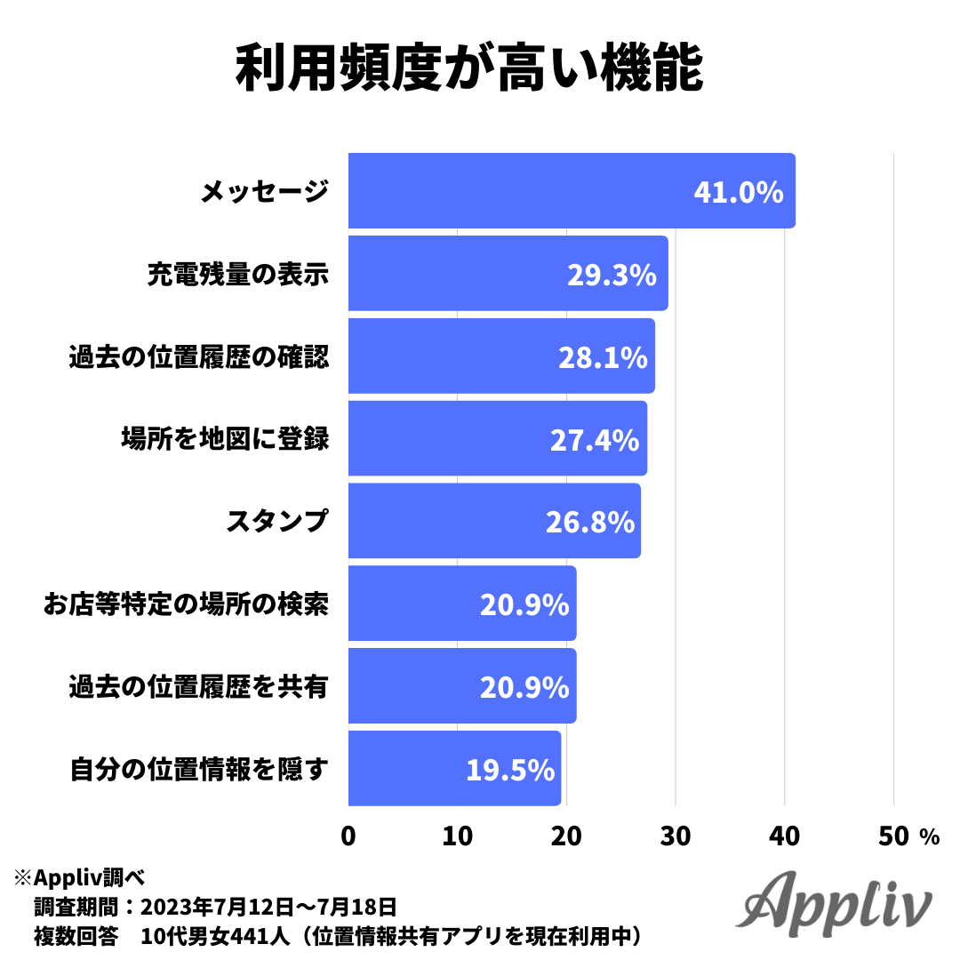 続いて、利用頻度が高い機能について尋ねたところ、最多は「メッセージ機能」で41.0%でした。2位以下は「電池残量の表示(29.3%)」、「過去の位置履歴の確認(28.1%)」、「場所を地図に登録(27.4%)」、「スタンプ(26.8%)」となっています。