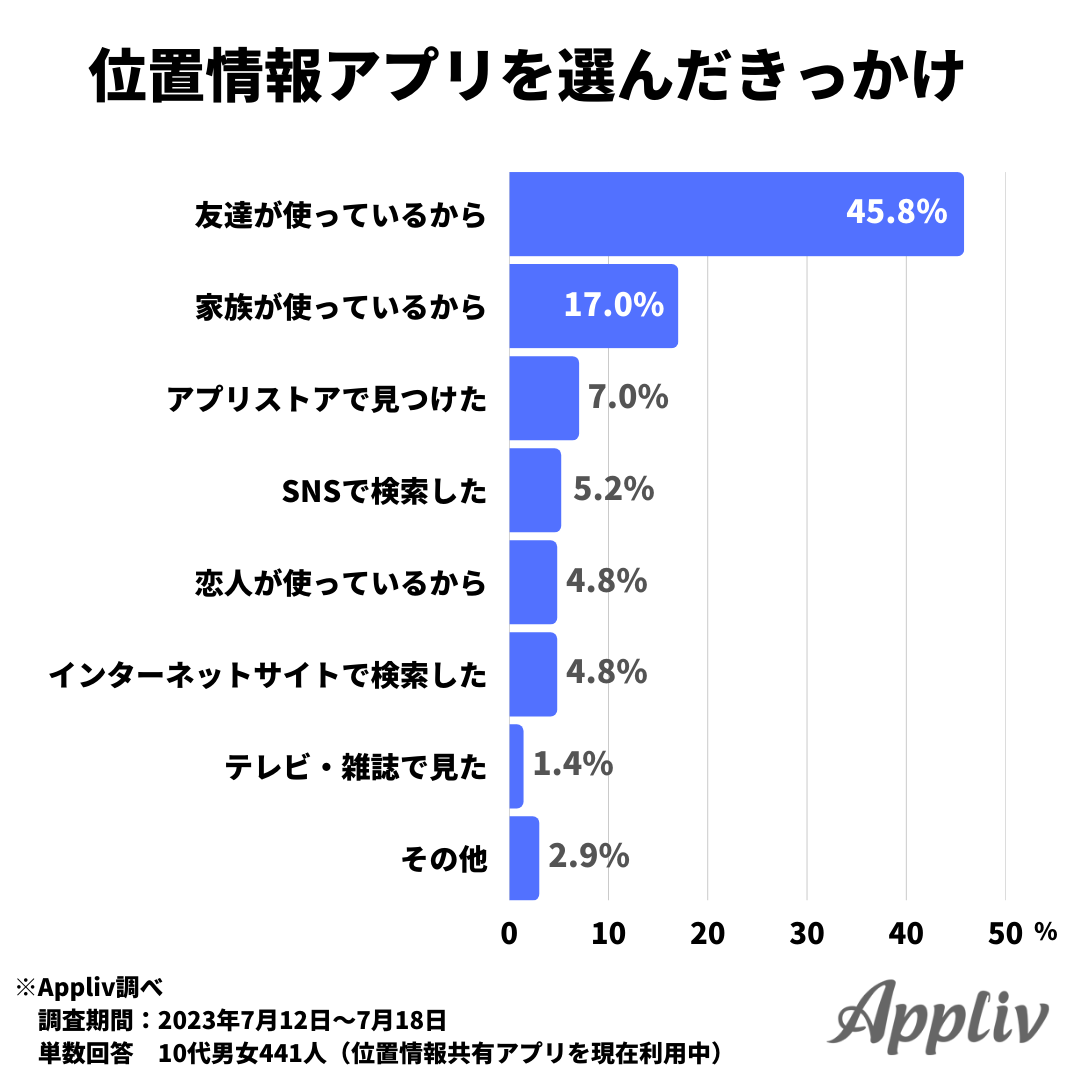 きっかけ別で内訳をみると、「友達が使っているから」と回答した人が最も多かったのは『whoo(66.0%)』、「家族が使っているから」と回答した人が最も多かったのは『Life360(37.3%)』でした。位置情報を共有する相手によって選ぶアプリが異なると考えられます。