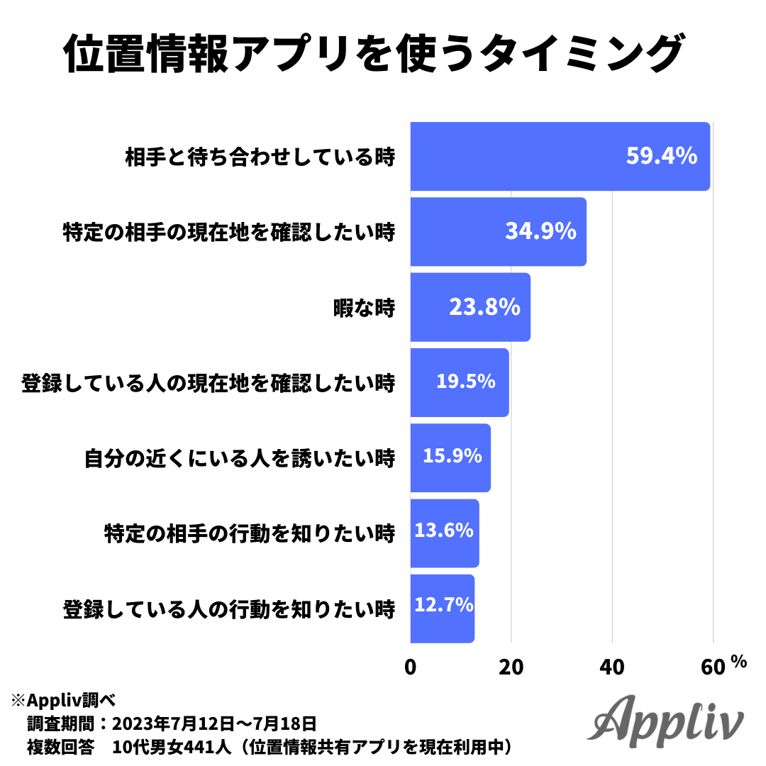2番目は「特定の相手の現在地を確認したい時」で34.9%、3番目は「暇な時」で23.8%と続きます。