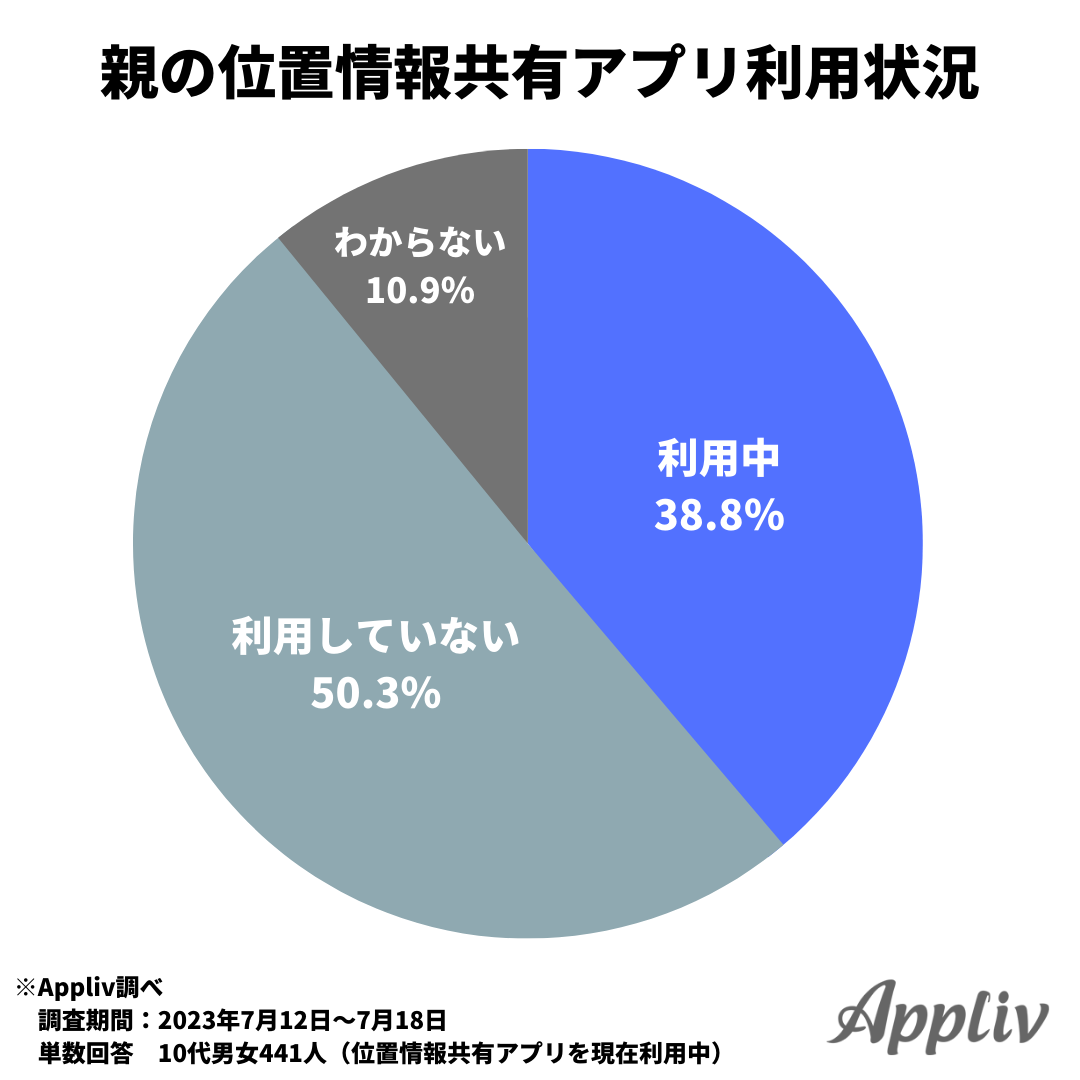 「親は利用していない(50.3%)」、「分からない(10.9%)」であることから、親子間でのコミュニケーションを目的に位置情報共有アプリを利用している割合は低いと考えられます。