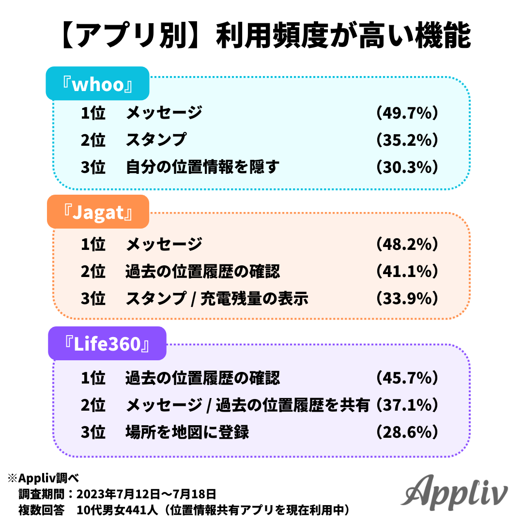 位置情報共有SNSに限定し、利用者数が多い上位3アプリの結果を個別にみてみると、全てのアプリに共通するのは「メッセージ」でした。『whoo』と『Jagat』においては「スタンプ」も選ばれており、コミュニケーションに役立つ機能がよく使われていることが分かります。