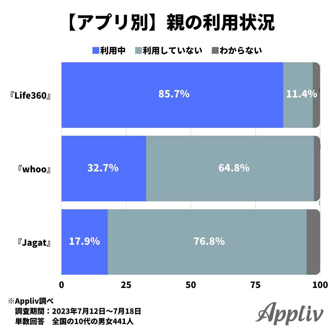 アプリ別で比較したところ、親子で利用している割合が最も高いのは『Life360』で85.7%でした。『whoo』は32.7%、『Jagat』は17.9%といずれも半数以下となっています。