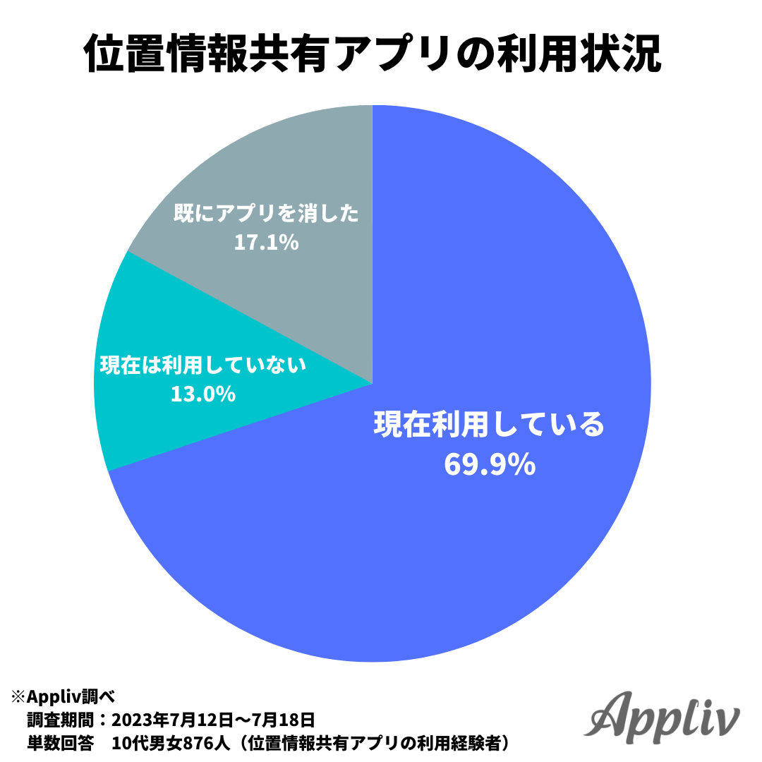このうち、「現在利用している」と回答したユーザーは69.9%、「アプリを入れているが、現在は利用していない(13.0%)」と回答した休眠ユーザーも含めると、10代の8割以上が位置情報共有アプリを所有していることが分かりました。