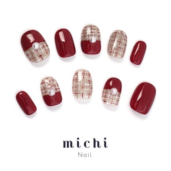 秋冬の大定番ボルドーは今の季節から年始まで使いたい人気のカラーです。流行りのツイードはベージュカラーで落ち着いた雰囲気に仕上がっています。真ん中に飾られた大きめパールが上品に輝く、これからの季節に持っておきたいネイルチップです。